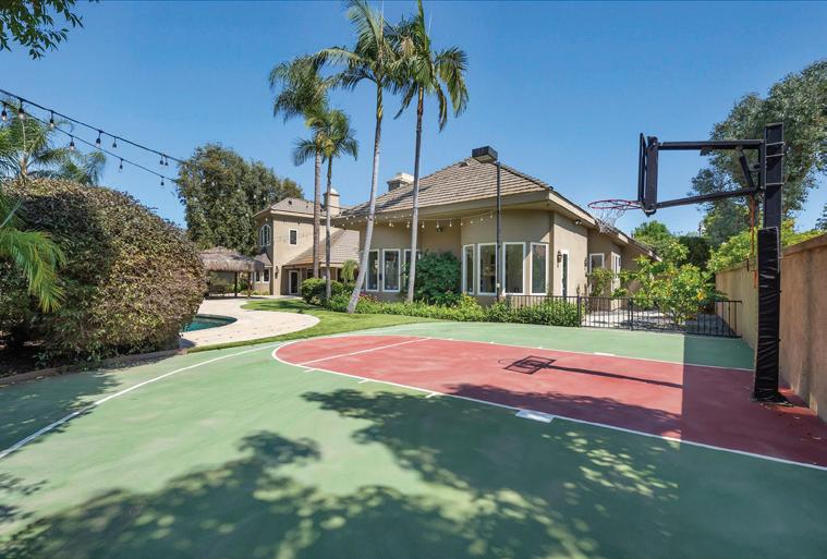 The resort-style backyard is an entertainer’s dream with a covered patio, outdoor kitchen, fireplace lounge with TV, pool, spa, fountain, putting green, and basketball court—all surrounded by lush landscaping and custom lighting.