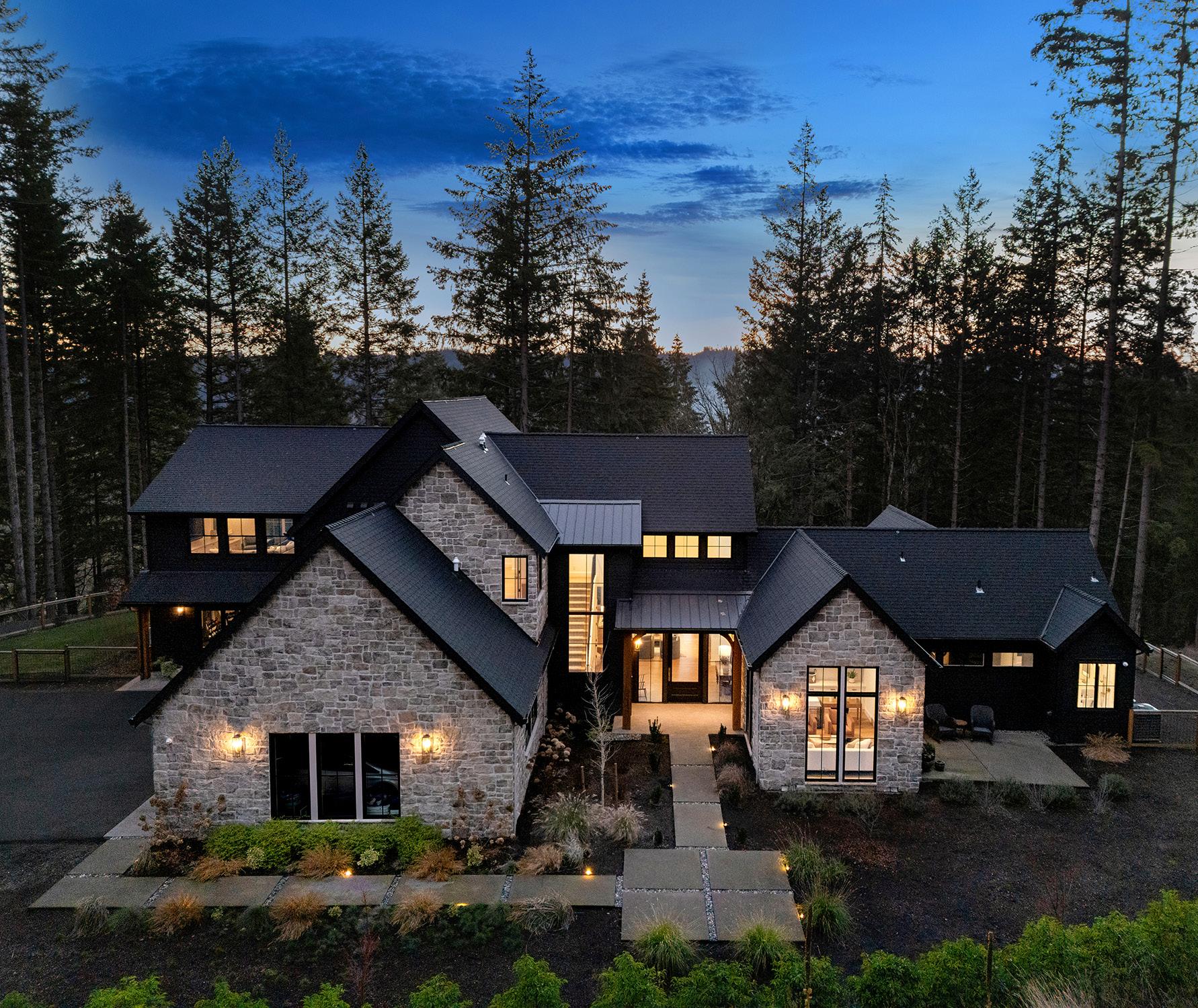 This custom home, completed by Westlake Development Group in 2022, is situated on 3.34 private acres in the coveted Stafford Hamlet of West Linn. This thoughtfully designed residence serves as a stunning woodland retreat, blending contemporary style with warm, inviting details throughout.