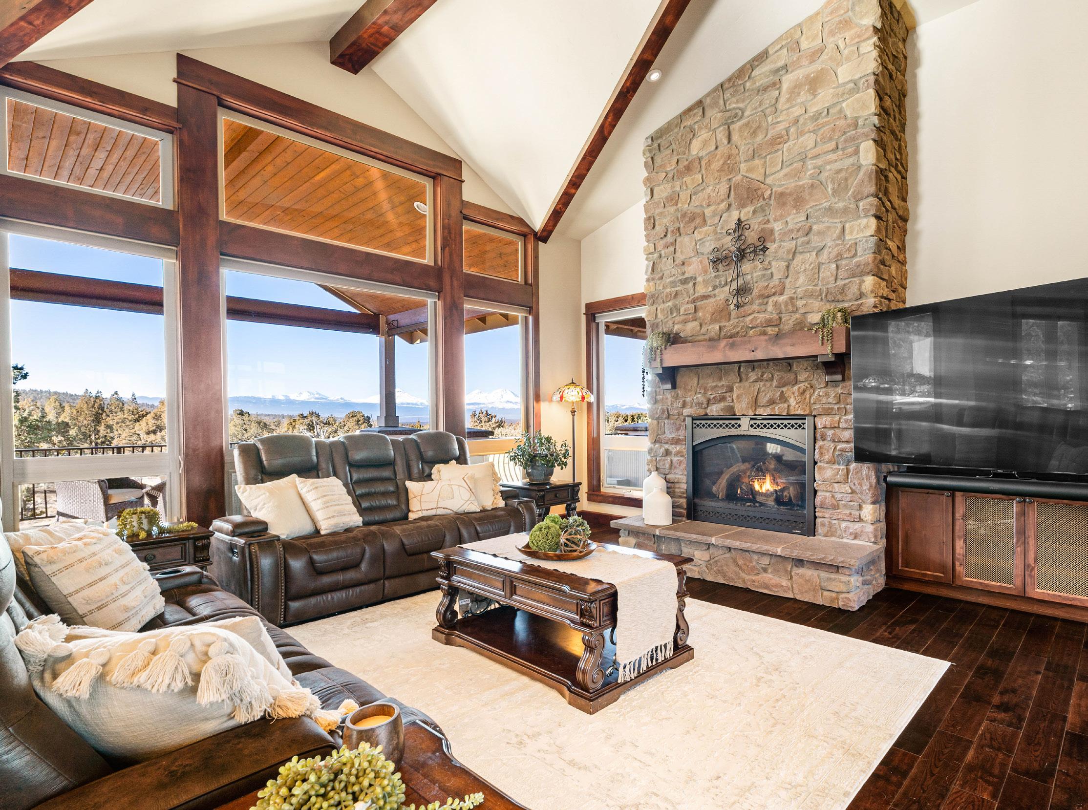 Gorgeous custom home with panoramic views of the Cascade Mountains and a very private setting that backs to common space and public land in Eagle Crest Resort. Timeless finishes including solid hardwood floors, knotty alder solid core doors and trim, hand troweled walls, slab granite countertops, and tile floors in the bathrooms, and mud room. Great room with soaring ceilings, floor-to-ceiling stone fireplace, an open kitchen with island and professional-grade appliances, and a spacious dining room that leads to the expansive covered TimberTech deck. Luxurious primary suite with stone fireplace, dual walk-in closets, soaking tub, walk-in shower, and dual sink vanity. Dedicated office with built-ins, mud room with abundant storage, and a half bath for guests complete the main level. You will find three additional guest rooms, a full bath, family room with fireplace and wet bar, plus a huge storage room on the lower level. Oversized 1124 Sq Ft triple-car garage.