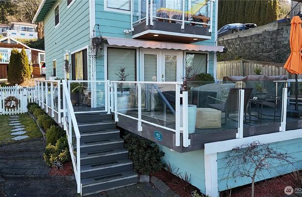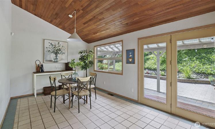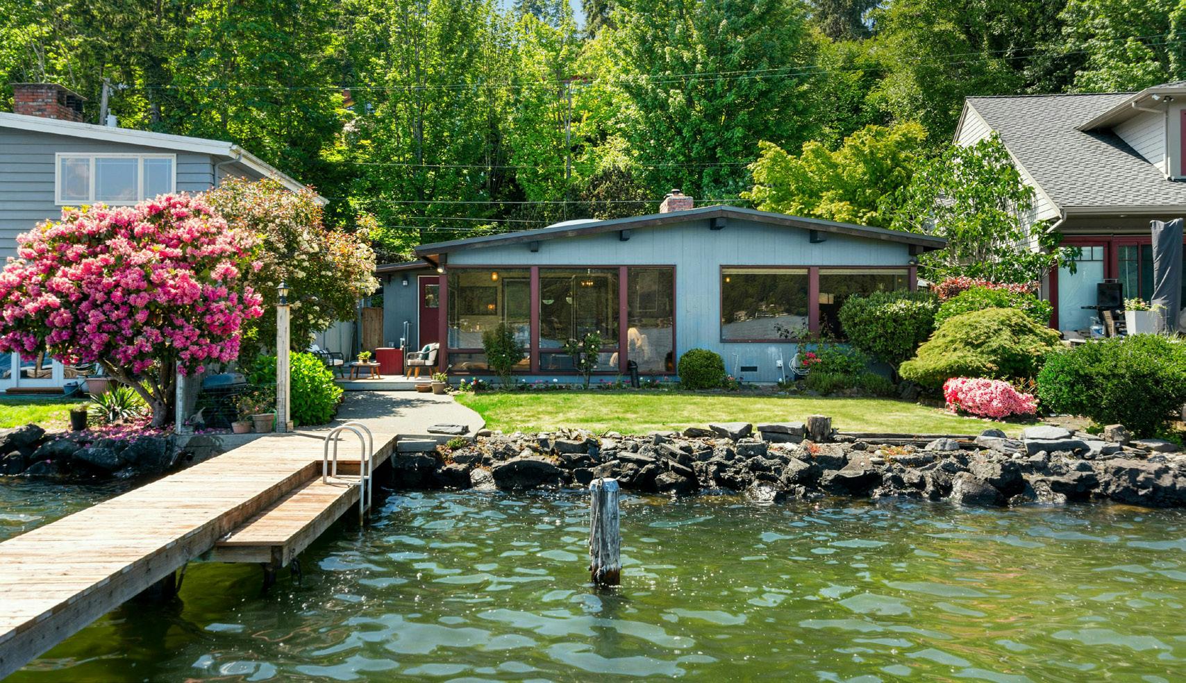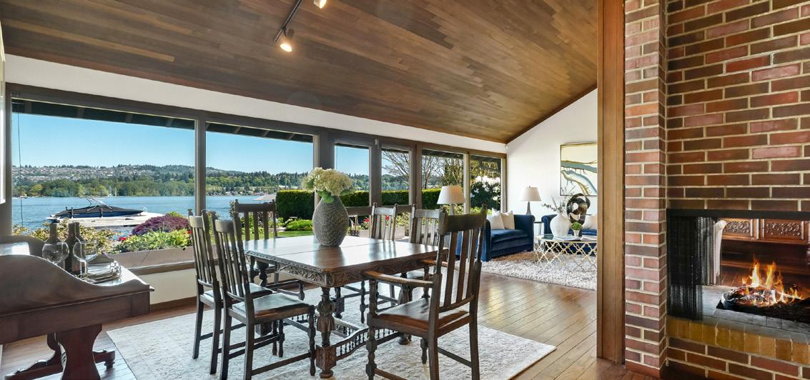 MLS 2379494 | $2,300,000 Charming mid-century modern home with 50 feet of prime waterfrontage on soughtafter Rivieria Place! Originally built in 1962, this 1,980 square foot home enjoys expansive views of Mt Rainier & the Cascade Mountains, St Edwards St Park to the east & both ends of Lake Washington. House sits on 14,502 square foot lot with 5,648 square feet of uplands and 8,854 square feet of second class shorelands. The 3 bedroom, 2 bathroom home, with various renovations over the years including an updated kitchen and standing seam metal roof, features vaulted ceilings with massive old growth timber beams and natural wood ceilings, brick fireplace, and cherry hardwood floors. Original lakeside patio was enclosed into a wonderful, light-filled sunroom with fireplace.