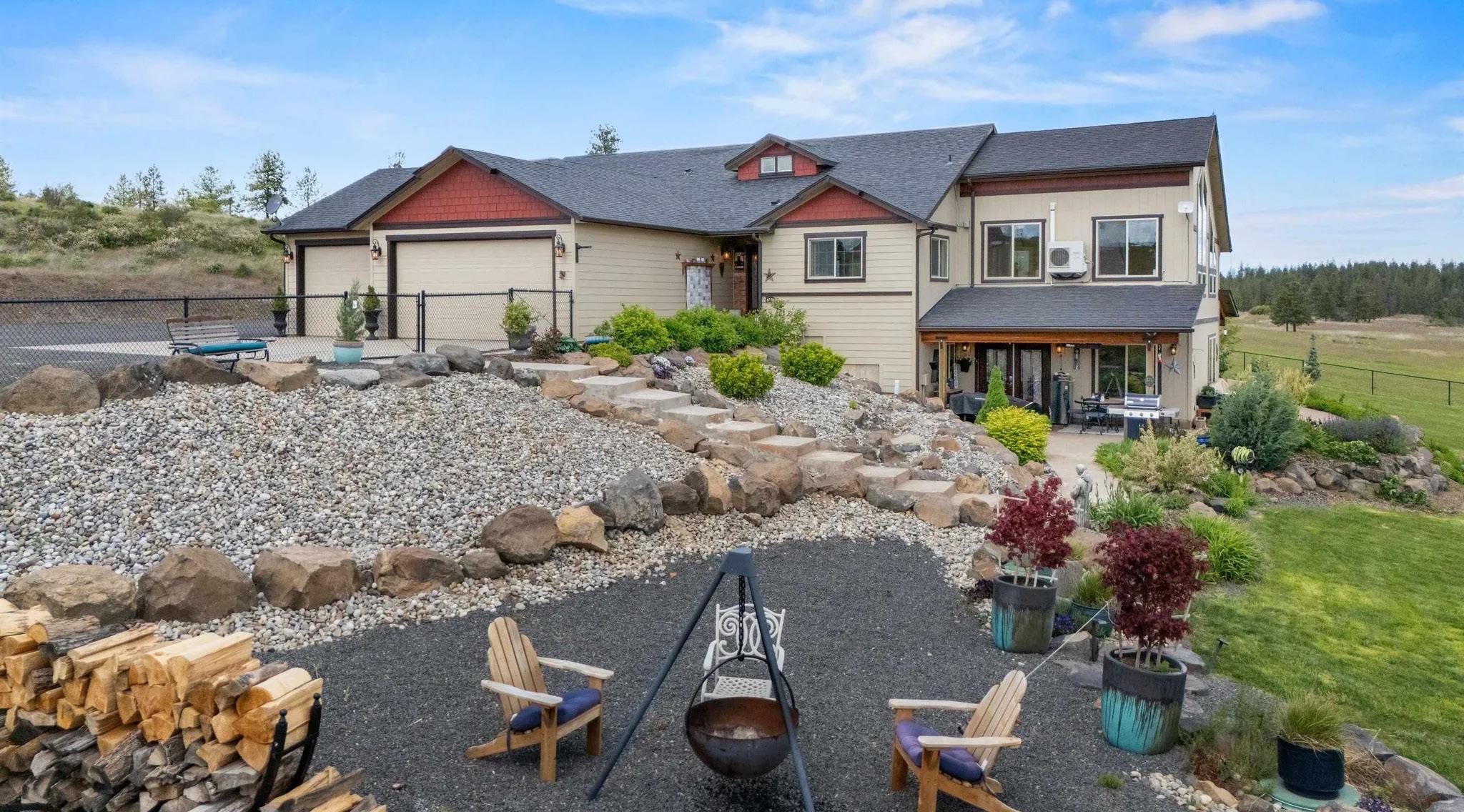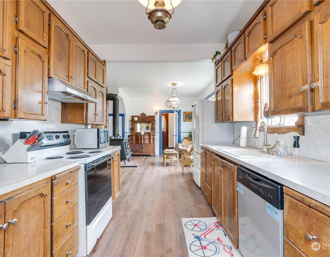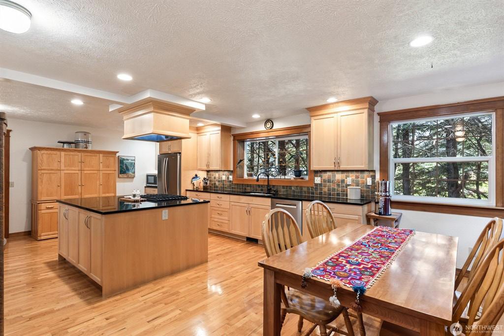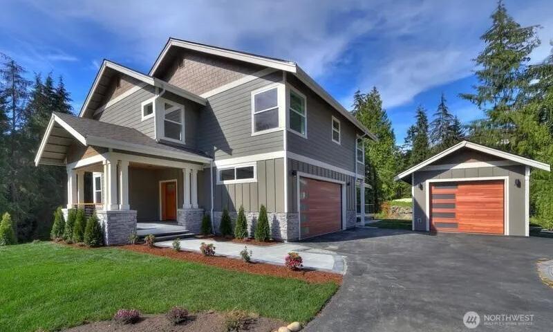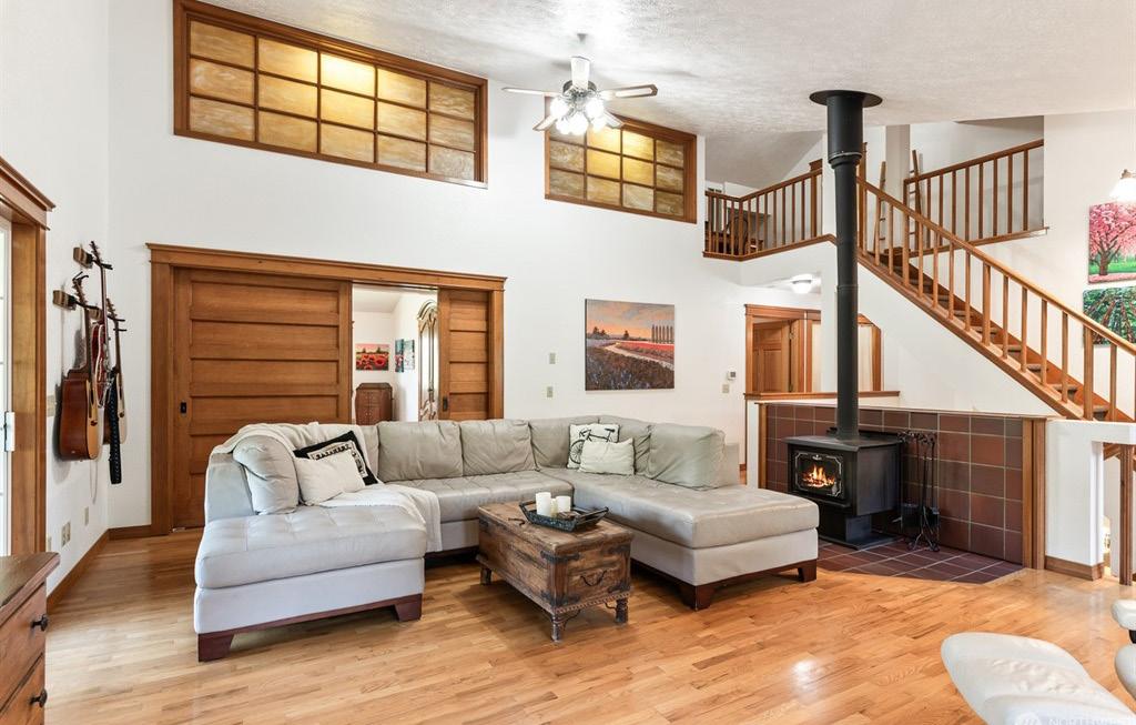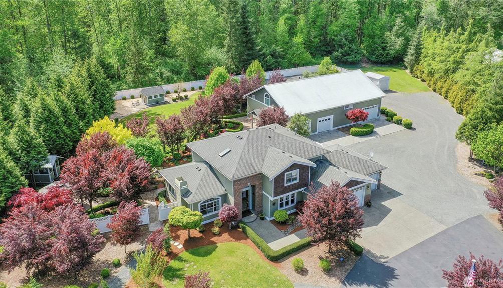 flexibility & connection to nature. Set back from the road, the home features vaulted ceilings, hardwood floors, open living areas, bright expansive chef’s kitchen, wood fireplace, incredible light filled spaces, primary suite, flex room w/vintage pocket doors & west-facing covered porch overlooking spacious yard. Oversized garage w/12’ ceiling & shop spaces, perfect for hobbies/storage. Plus, attached but separate ground-lvl partially finished house offers excellent potential-guest space, rental or studio. Enjoy nearby forestlands trails, Whistle Lk, Heart Lk & Mt Erie. Peaceful retreat with room to live, create, entertain & explore. MLS #2369332
