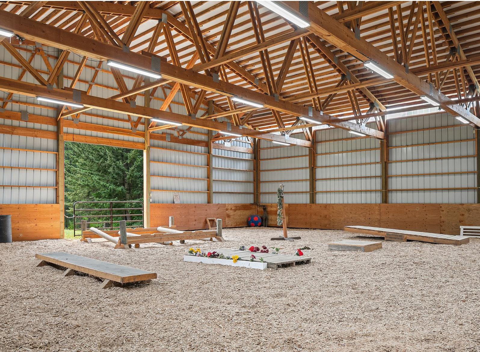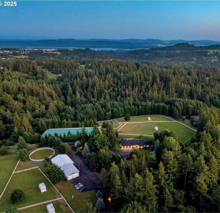 Premier 10.5-acre equestrian estate with a 22,000 SF Olympic-size clear-span dressage arena, remodeled designer home, and large multi-bay shop. The 3-bed, 2.1-bath, 3,596 SF single-level home features a gourmet kitchen, vaulted great room, maple floors, cedar ceilings, and expansive views from a 1,000 SF deck. The primary suite includes dual walk-ins, jetted tub, and custom shower. Equestrian amenities: ten 12x17 stalls, heated tack room, hot/cold wash rack, 70’ round pen, and five Centaur®-fenced pastures. Gated entry, fiber internet, CCTV, and hidden safe room. Zoned R-5. Just 25 min to PDX.