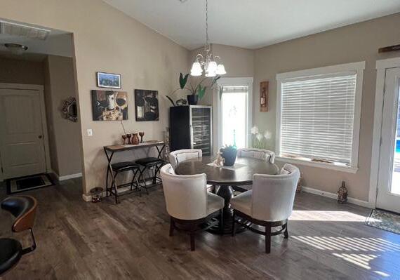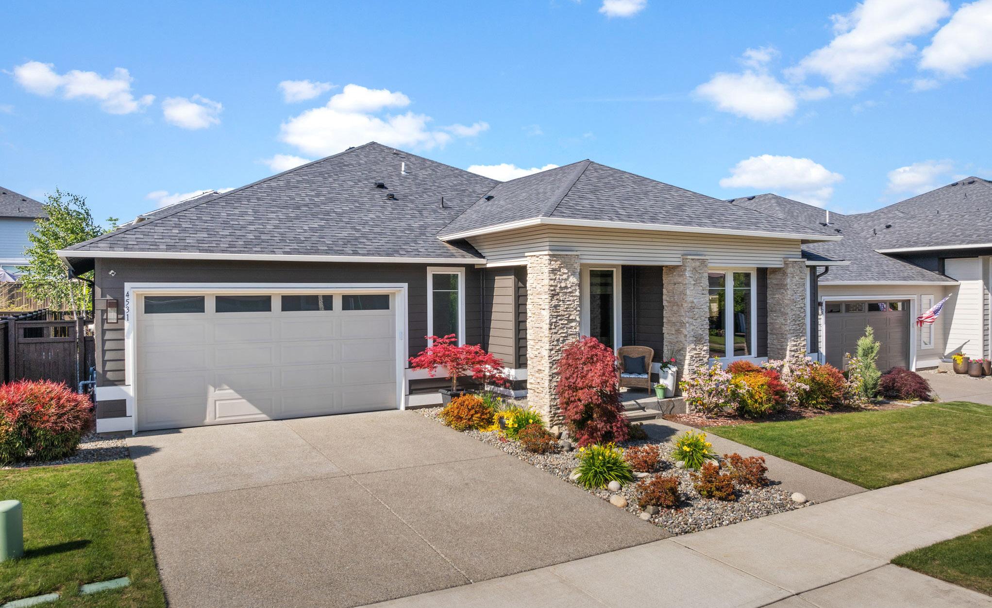 This beautifully maintained, like-new rambler features luxury wide plank flooring, 9’ ceilings, and an inviting open entry that sets a warm, welcoming tone. Enjoy the comfort of a gas fireplace and a spacious 5-piece primary suite complete with a walk-in closet. The kitchen is both stylish and functional, offering rich brown cabinetry, white quartz countertops, a large center island with bar seating, and under-cabinet lighting for added ambiance. Outside, the fully landscaped front and back yards include a retaining rock wall, with the backyard backing to a canal that offers peaceful, seasonal water views. Relax in comfort on the covered patio—perfectly shaded for warm afternoons—and enjoy the built-in gas connection for effortless BBQs. Additional highlights include Bali blinds throughout, room for RV parking, and a generous 600 sq ft two-car garage. Ideally located near schools, shopping, medical facilities, and scenic walking trails. 985