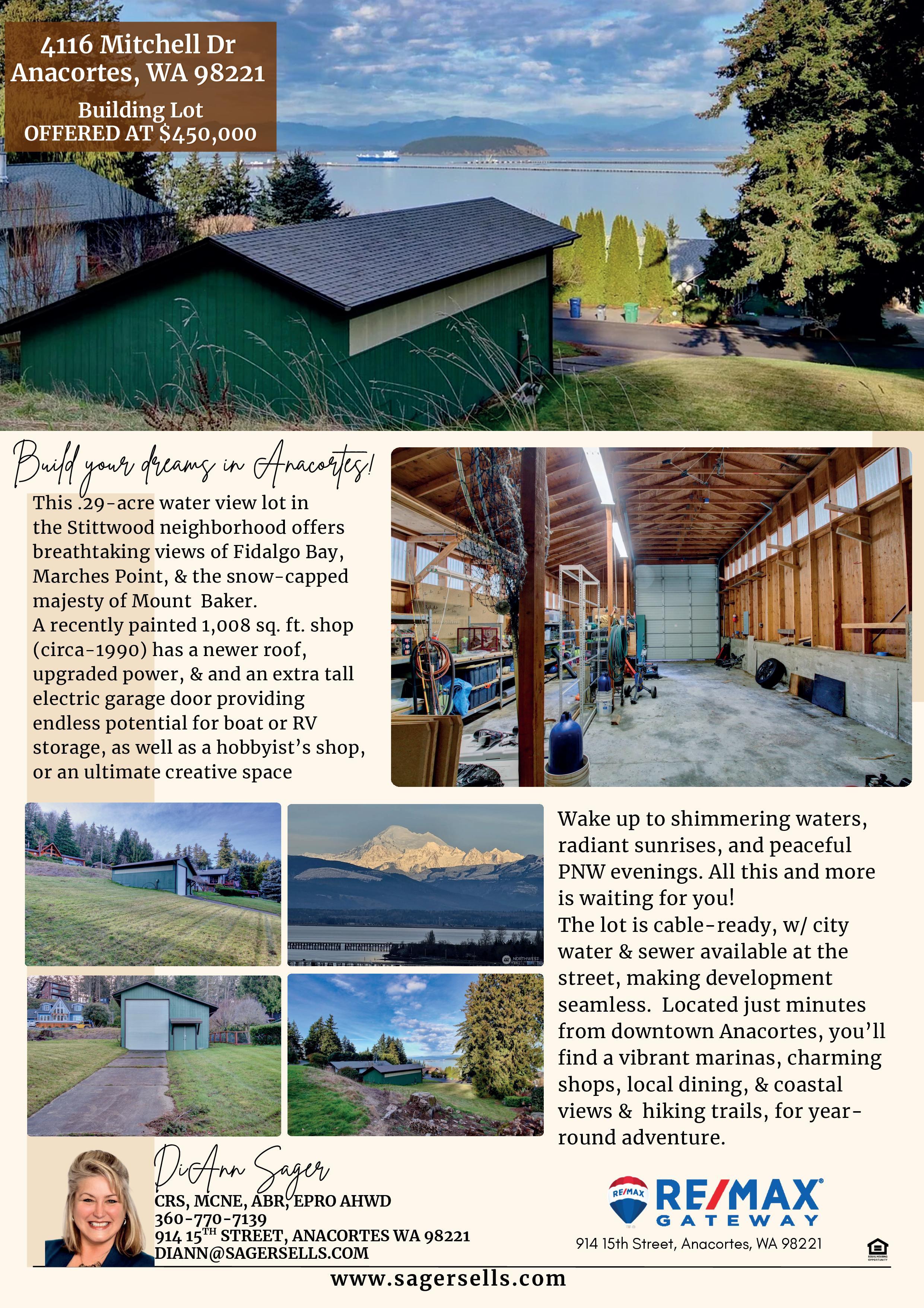 Anacortes 0.46 ac WATERVIEW BUILDING lot with views of Fidalgo Bay, the sound & mountains. City utilities are available at the street w/ water line & meter installed on the lot. Boundary & topo surveys, soils report & preliminary site plan are completed. Cities high fiber is in the street. One of the last lots in the popular Stittwood neighborhood with easy access to downtown shopping, marina, Hwy. 20, Anacortes Community Forestlands & more. The lot is ready for your house plans. Seller’s Preliminary house plans are available to a buyer & ready for submission to the city.