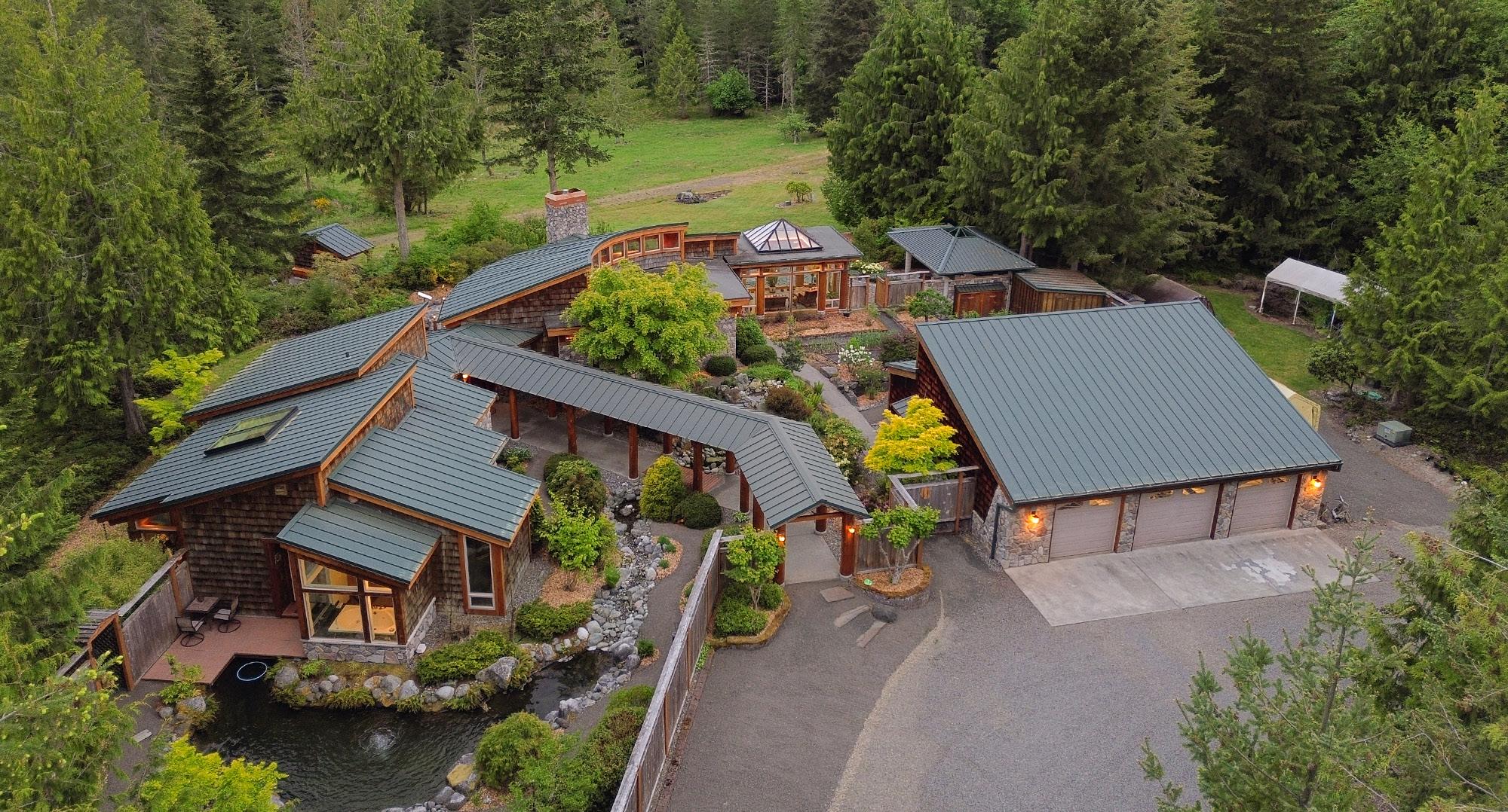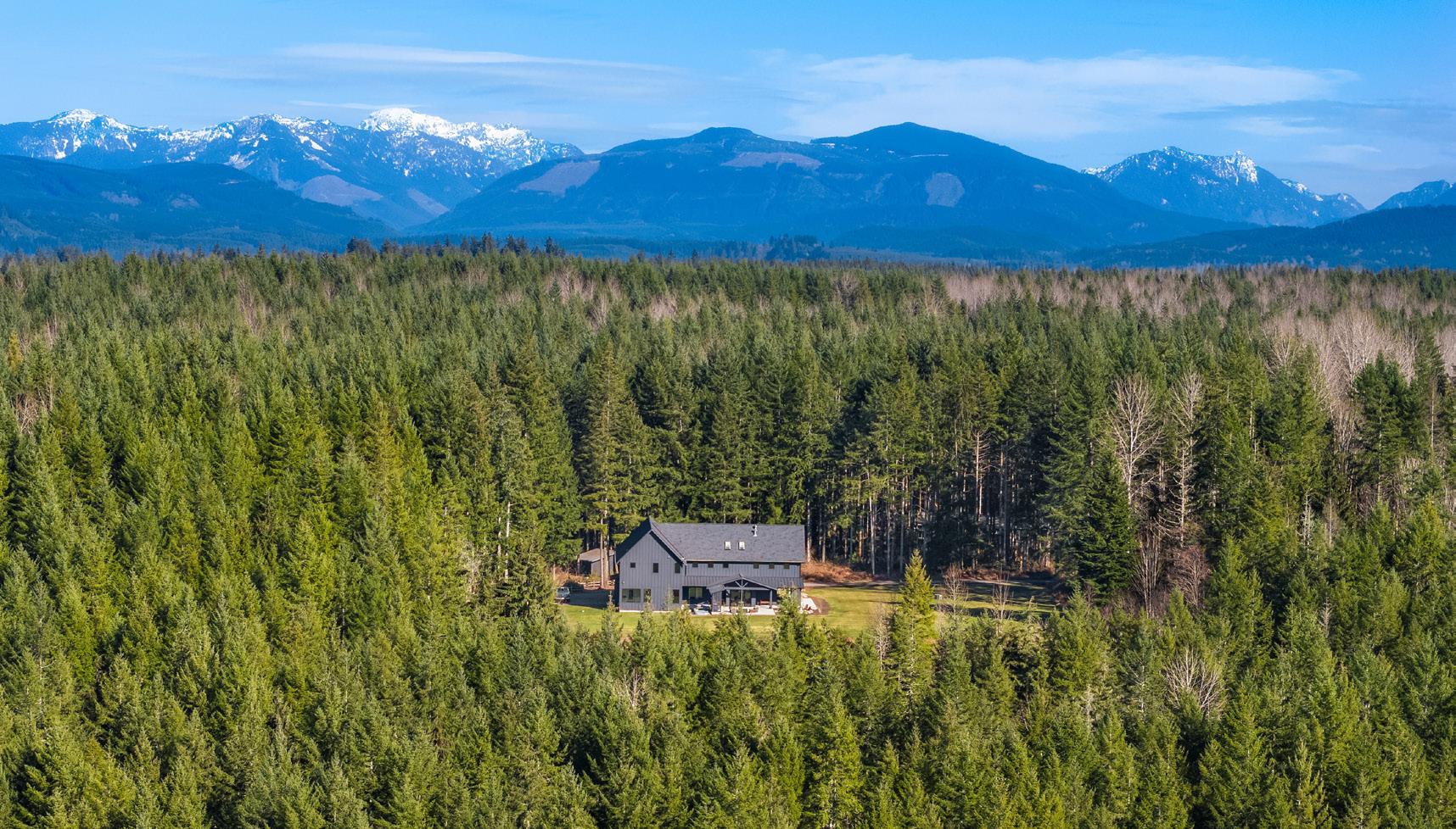 Architectural masterpiece! Nearly 40 private acres with commanding mountain views, custom finishes & sustainable luxury nestled in the pristine Pacific Northwest beauty, this extraordinary estate is a true work of architectural art—designed with intention, craftsmanship, and reverence for the land. Every element has been curated with extraordinary vision. Step inside and feel the warmth of radiant floors beneath your feet, natural light filtering through floor-length windows, and hand-finished woodwork shaped from a single Douglas fir tree. Bamboo ceilings, custom beams, and organic textures echo the surrounding forest, while subtle modern comforts—like whole-home audio, a chef’s kitchen, and seamless indoor-outdoor flow—support an effortless lifestyle. One-of-a-kind sanctuary, seamlessly blending luxury with sustainability and timeless design. Expansive courtyard gardens bloom around the waterfall, koi ponds and abundant curated plantings, while mature timber and private water supply promise long-term value and sustainability. This is a home for those who seek beauty in the details, intention in the design, and complete privacy without compromise.