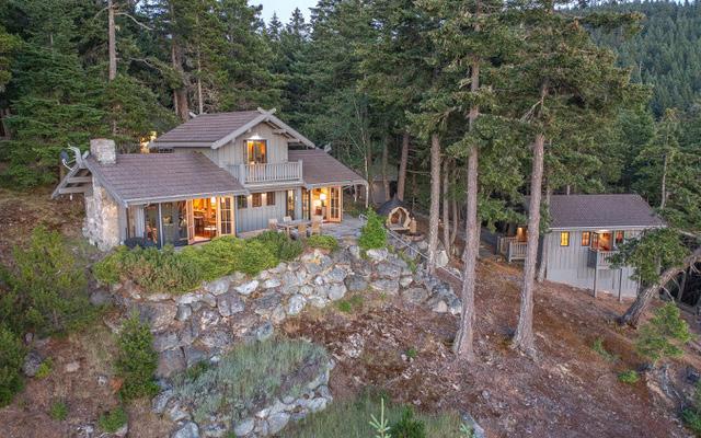 You have arrived. Left the busy life at the bottom of the mountain. Magic in the forest welcomes you at the top. Upon arrival the view pulls you in. You know you are somewhere special. This very unique property is located at one of the highest elevations in the San Juan Islands. You will feel like you are floating on top of the world. Incredible views of Eastsound, Bellingham, Vancouver BC, Sucia Island, Waldron Island, Matia Island, Patos Island, Spieden Island and the Canadian Gulf Islands! The structures are well thought out, designed to give space when you need it, but also share moments with the ones you want to be with. Three distinctly different structures: Main Home with full kitchen, fireplace, primary bedroom ensuite, upper office/deck + 1.5 bath; Sauna Cottage with 1 bedroom/full bath, studio kitchen and new Harvia Sauna; And the Blue Cottage with open bedroom/ensuite +viewing deck. Custom flagstone pathways and stone staircases with handrails connecting all the dwellings.