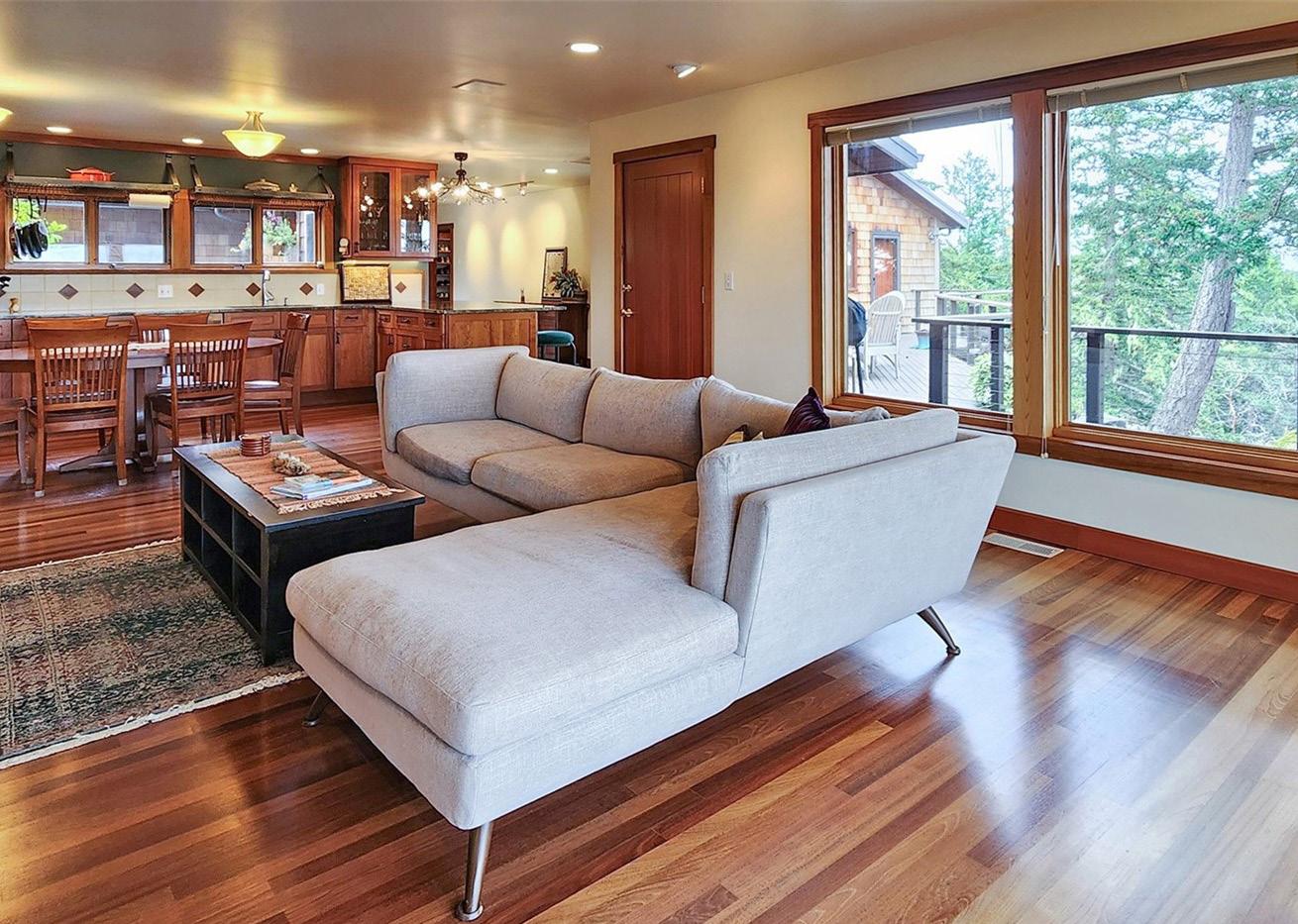 Located on 5 private wooded acres between Orcas Village and Dolphin Bay Road. Expansive, breathtaking marine views from this home supporting island living at its best. The floor plan is crafted to showcase water and mountain views from all rooms. High quality in 2008, impeccably maintained by the owners. The spacious kitchen is anchored by a cozy seating area with expansive floor to ceiling windows and propane fireplace to keep you warm. Entertain guests at the bar on lower level or invite them in to the spacious kitchen. Two guest suites/bath on the main. Large primary suite featuring gorgeous counters, deep soaking tub, separate shower & sauna. bed/bath on lower level. Office/studio loft for a bonus.
