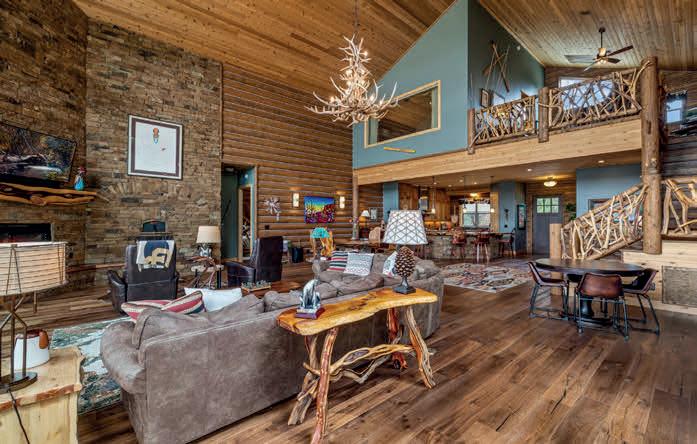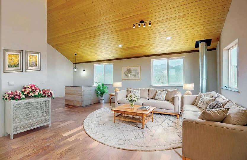 • Second-floor great room with hardwood floors, kitchenette, and mountain views.