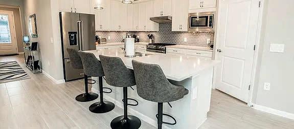 • Gourmet kitchen with custom cabinets, stone countertops, stainless steel appliances, and an oversized breakfast bar
