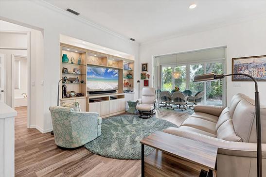 In gated Belleview Place on Belleair Country Club’s historic grounds, this blufftop home blends modern design with tranquil views. Walls of windows brighten the open living space, while two private balconies invite you to relax. Wide-plank wood floors, a sleek kitchen, and a split-bedroom plan combine style and comfort.