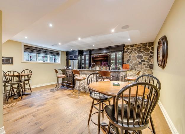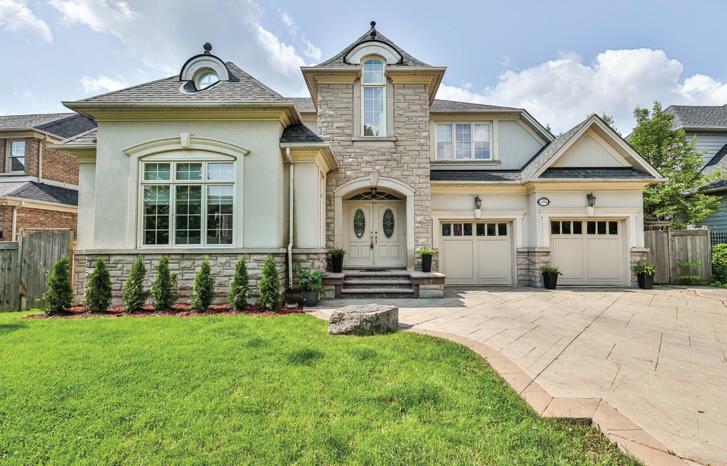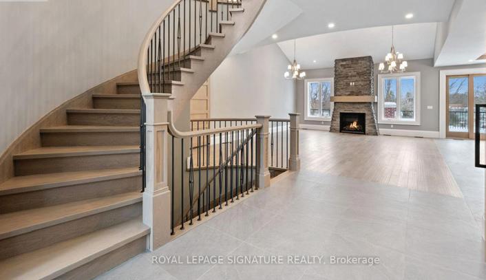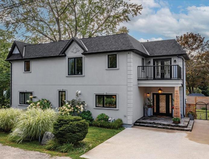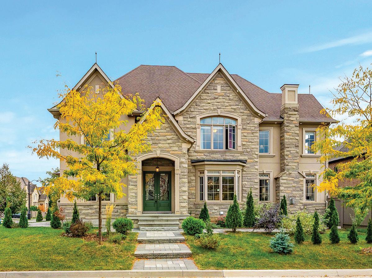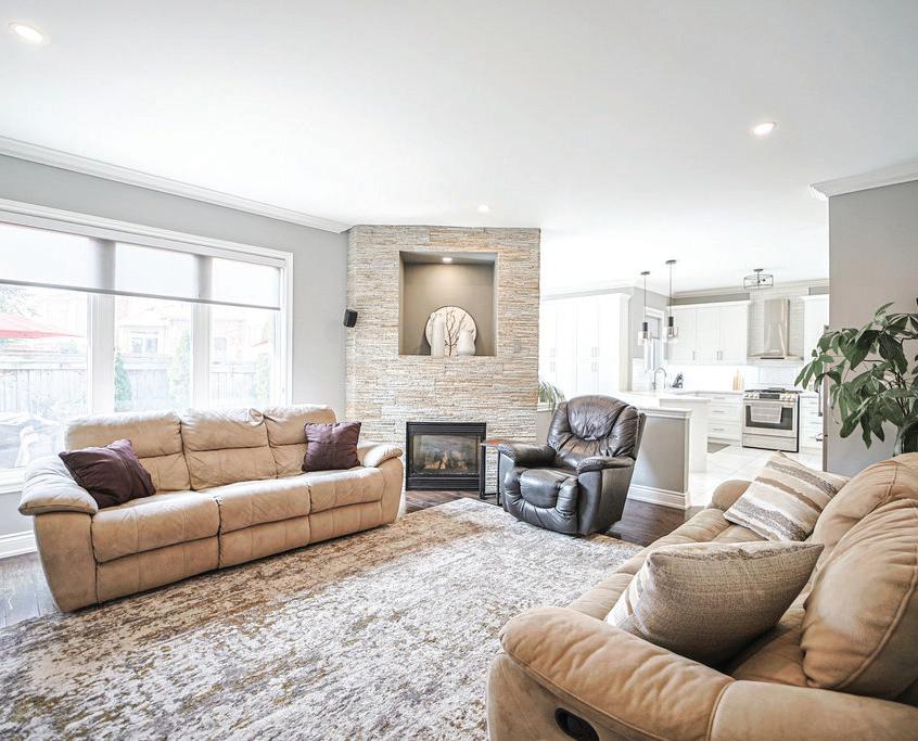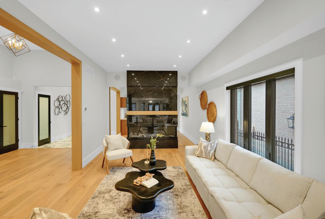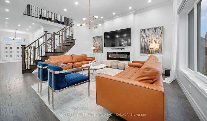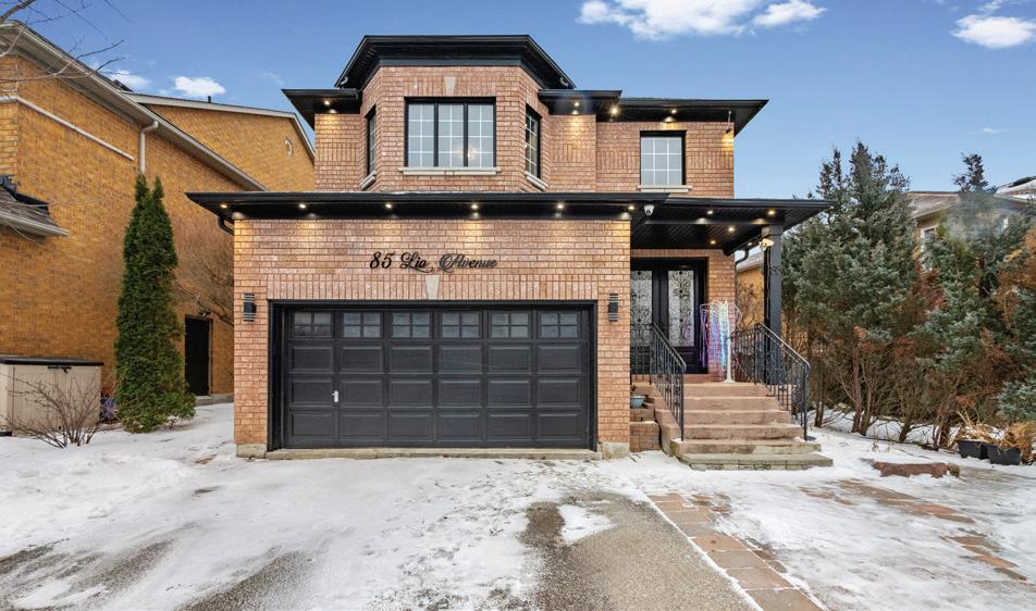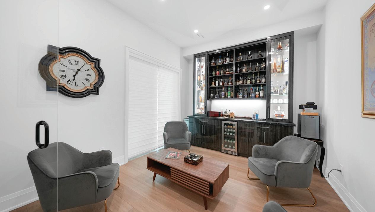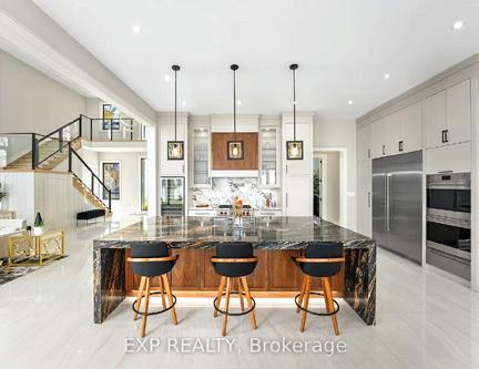 Completely reimagined luxury bungalow offering over 4,800 sq ft of refined living space on a premium landscaped lot in one of Woodbridges most desirable enclaves. No detail has been overlooked in this topto-bottom transformation. The exterior showcases a natural stone facade with tiger stripe accents, 9 custom insulated garage doors, upgraded black gutters and fascia with LED pot lights, a new roof (2017), and oversized high-efficiency windows (2020). The grounds have been professionally landscaped w herringbone stone walkways, granite coping steps, mature trees, front and rear sprinkler system w Wi-Fi controls, night vision security cameras, uplighting, and a massive rear patio with matching stone design, speaker rough-ins, and EVready garage with secondary panel. Step inside to soaring ceilings, oversized porcelain foyer tile, a custom white oak staircase with glass railing, Astoria walnut engineered hardwood, solid wood/glass interior doors, oversized baseboards, and over 100 LED pot lights. Savant smart automation connects lighting, blinds, and speakers throughout. The brand new Italian-imported Scavolini kitchen features quartz counters, waterfall island, fluted glass-panel cabinetry, JenAir built-in appliances, LED undercabinet lighting, dining room with custom built-in buffet and 65 smart TV. The family room boasts a 72 three-sided porcelain fireplace, home theatre wiring, and oak detailing, while the office offers 11 vaulted ceilings, built-ins, and power blinds. The primary suite includes expanded windows, stone fireplace, automated blinds, integrated speakers, and a spa-inspired ensuite with custom vanity, fluted tub, oversized tile, and LED accents. The fully finished lower level offers an entertainers dream with a projector, Dolby 7.1 surround sound, modern dry bar, real brick feature walls, new powder room, storage, and a 2-bedroom in-law suite with separate entrance, brand new kitchen, bath, and laundry central vac, Nest system, 200AMP service,