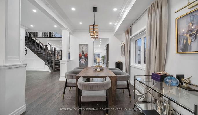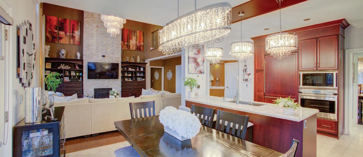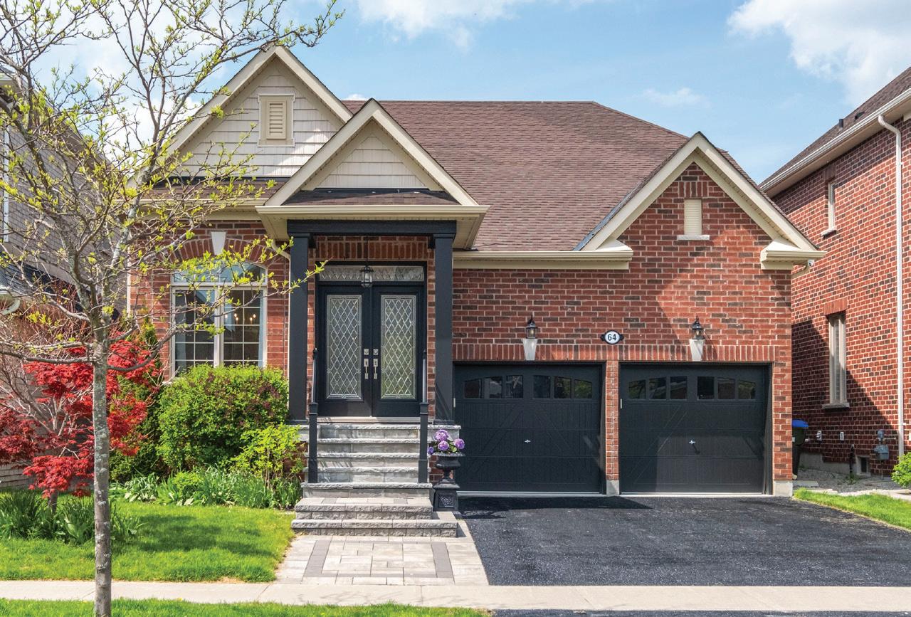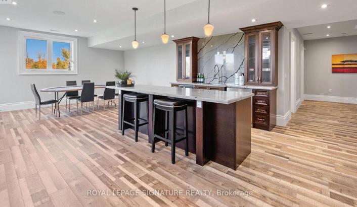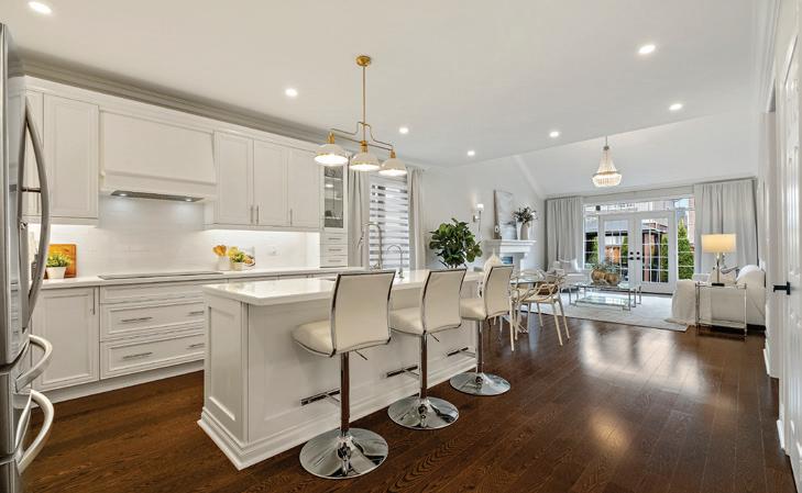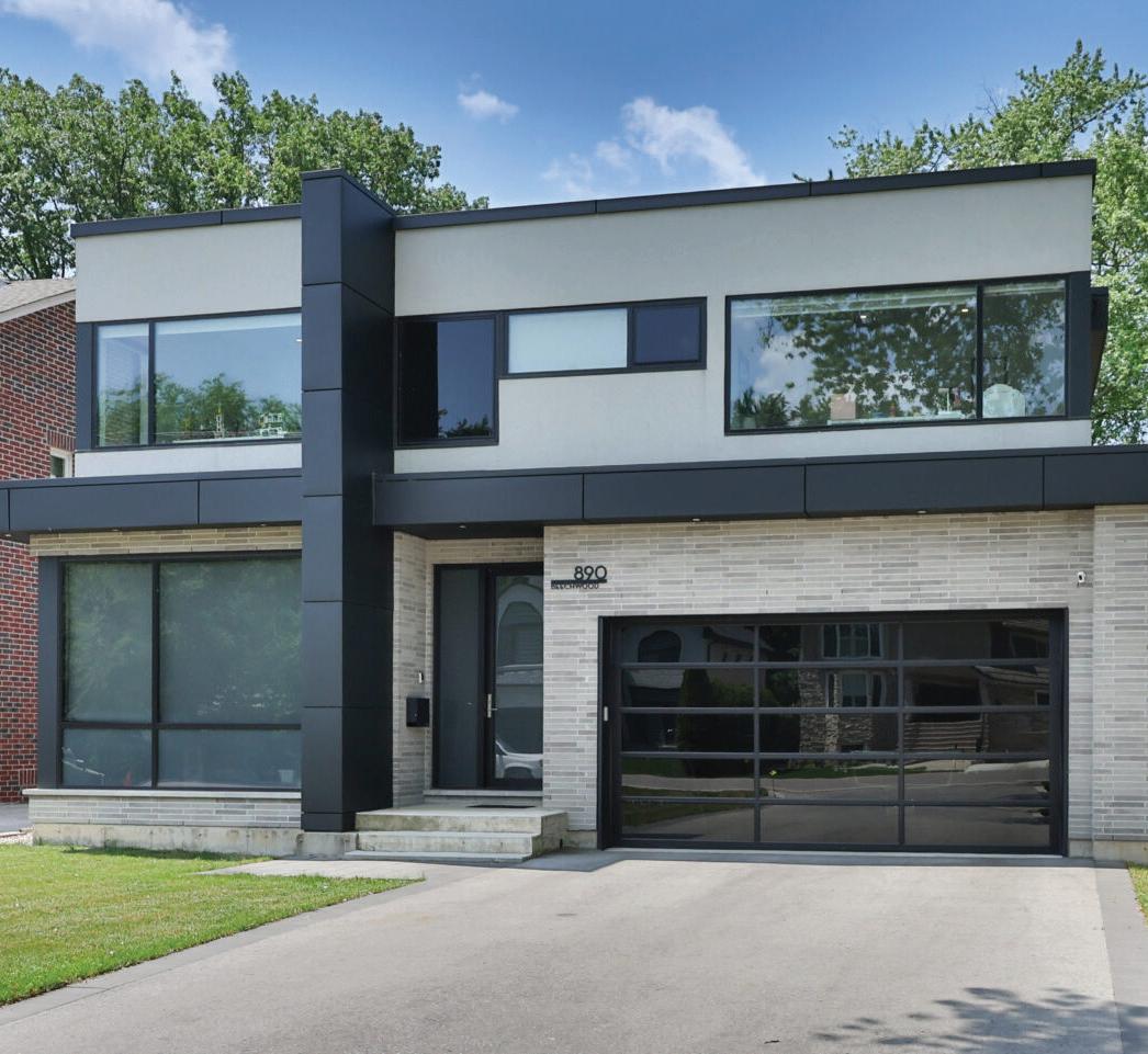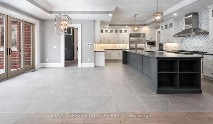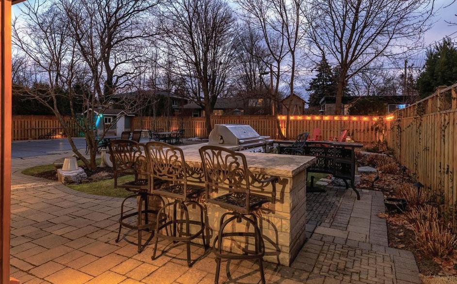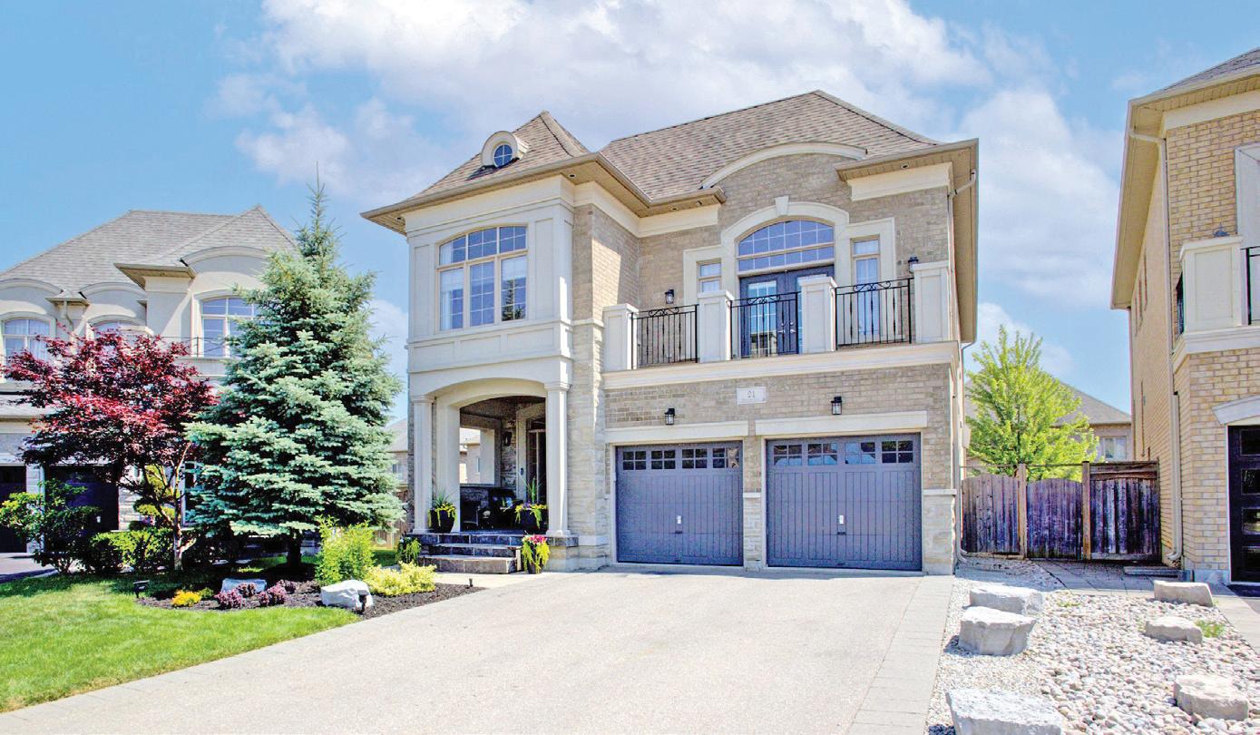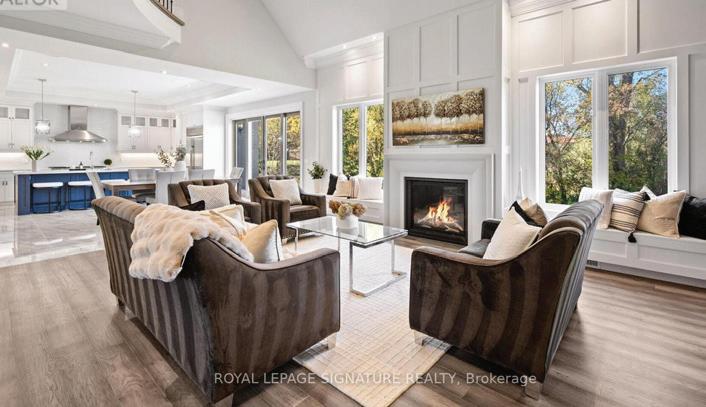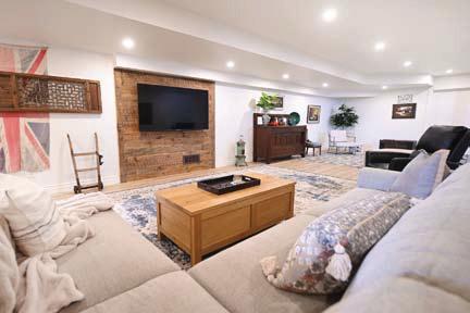 Completely reimagined luxury bungalow offering over 4,800 sq ft of refined living space on a premium landscaped lot in one of Woodbridges most desirable enclaves. No detail has been overlooked in this topto-bottom transformation. The exterior showcases a natural stone facade with tiger stripe accents, 9 custom insulated garage doors, upgraded black gutters and fascia with LED pot lights, a new roof (2017), and oversized high-efficiency windows (2020). The grounds have been professionally landscaped w herringbone stone walkways, granite coping steps, mature trees, front and rear sprinkler system w Wi-Fi controls, night vision security cameras, uplighting, and a massive rear patio with matching stone design, speaker rough-ins, and EVready garage with secondary panel. Step inside to soaring ceilings, oversized porcelain foyer tile, a custom white oak staircase with glass railing, Astoria walnut engineered hardwood, solid wood/glass interior doors, oversized baseboards, and over 100 LED pot lights. Savant smart automation connects lighting, blinds, and speakers throughout. The brand new Italian-imported Scavolini kitchen features quartz counters, waterfall island, fluted glass-panel cabinetry, JenAir built-in appliances, LED undercabinet lighting, dining room with custom built-in buffet and 65 smart TV. The family room boasts a 72 three-sided porcelain fireplace, home theatre wiring, and oak detailing, while the office offers 11 vaulted ceilings, built-ins, and power blinds. The primary suite includes expanded windows, stone fireplace, automated blinds, integrated speakers, and a spa-inspired ensuite with custom vanity, fluted tub, oversized tile, and LED accents. The fully finished lower level offers an entertainers dream with a projector, Dolby 7.1 surround sound, modern dry bar, real brick feature walls, new powder room, storage, and a 2-bedroom in-law suite with separate entrance, brand new kitchen, bath, and laundry central vac, Nest system, 200AMP service,