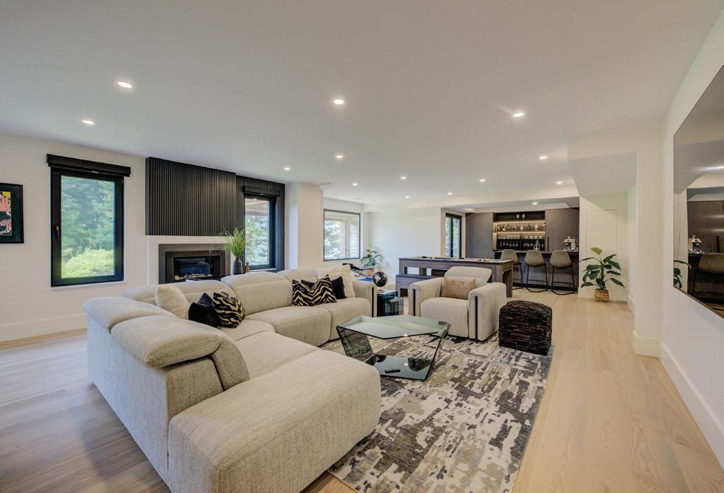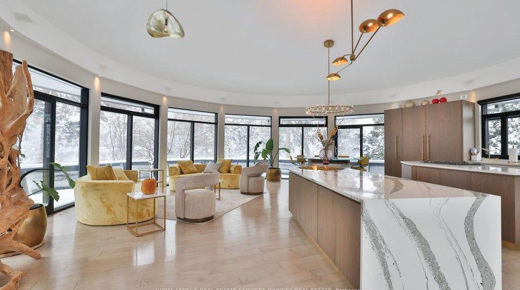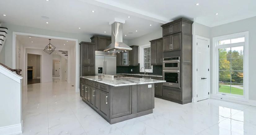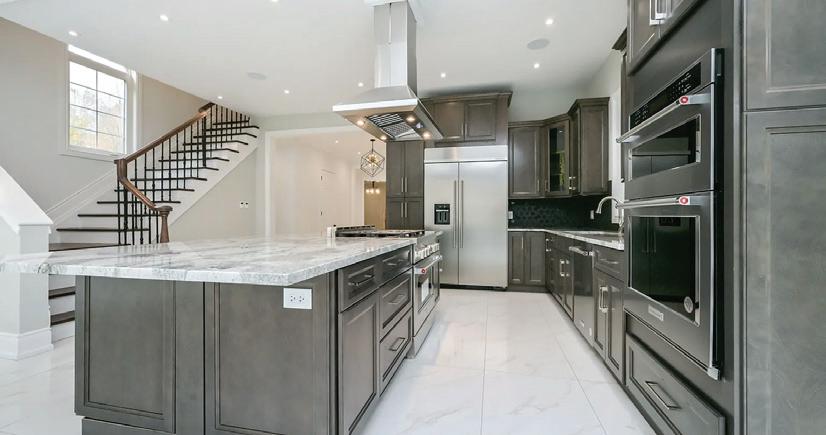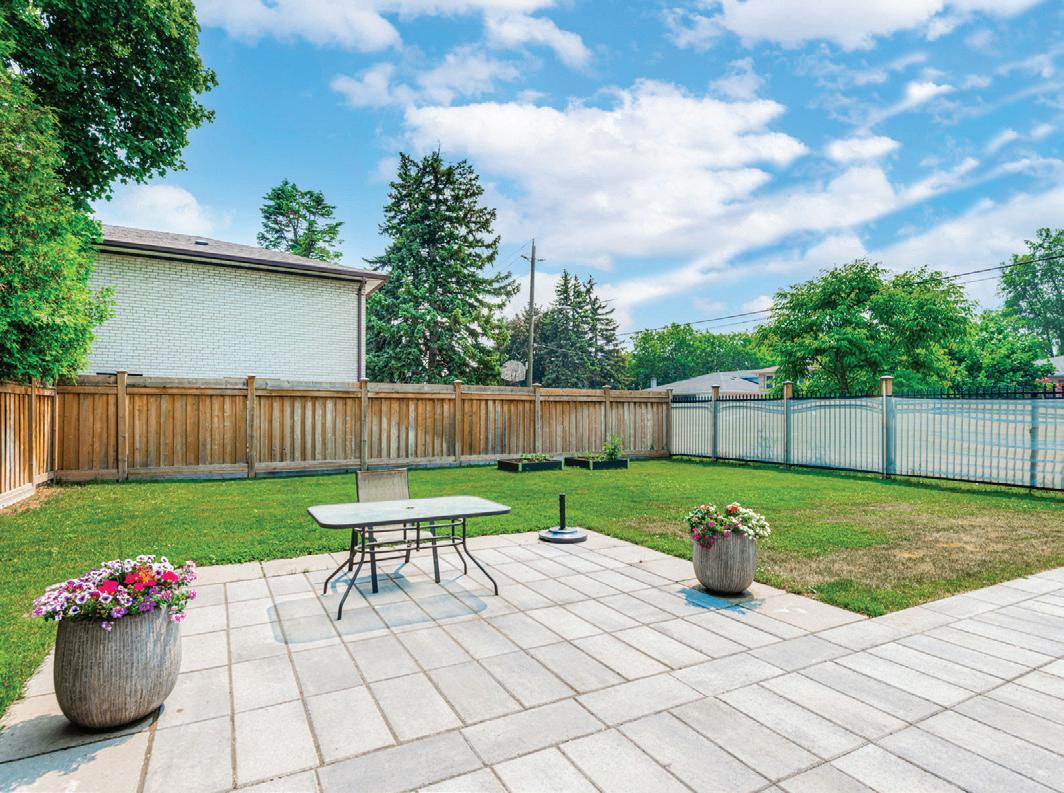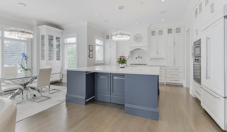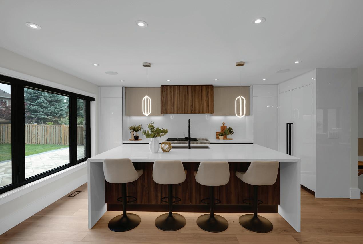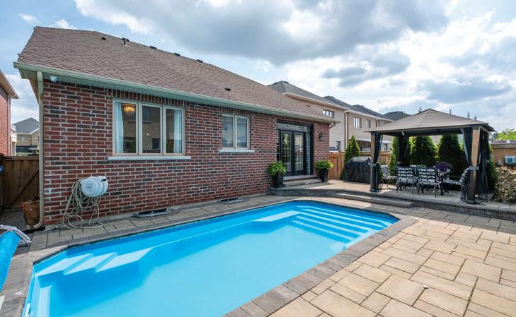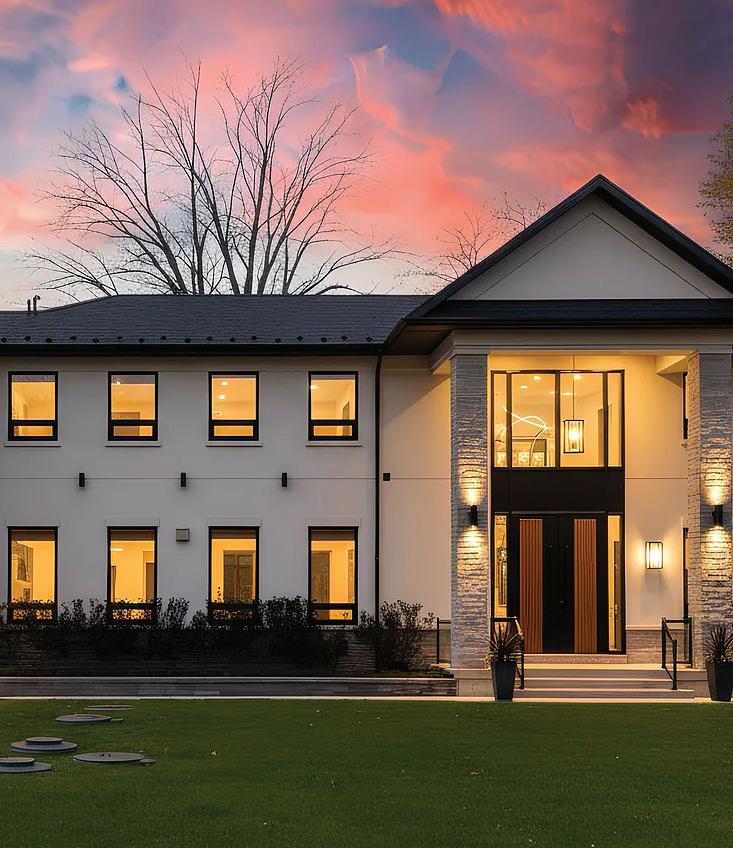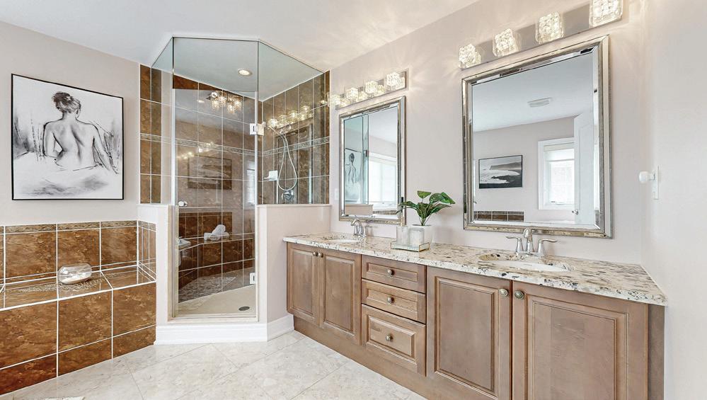 Completely reimagined luxury bungalow offering over 4,800 sq ft of refined living space on a premium landscaped lot in one of Woodbridges most desirable enclaves. No detail has been overlooked in this topto-bottom transformation. The exterior showcases a natural stone facade with tiger stripe accents, 9 custom insulated garage doors, upgraded black gutters and fascia with LED pot lights, a new roof (2017), and oversized high-efficiency windows (2020). The grounds have been professionally landscaped w herringbone stone walkways, granite coping steps, mature trees, front and rear sprinkler system w Wi-Fi controls, night vision security cameras, uplighting, and a massive rear patio with matching stone design, speaker rough-ins, and EVready garage with secondary panel. Step inside to soaring ceilings, oversized porcelain foyer tile, a custom white oak staircase with glass railing, Astoria walnut engineered hardwood, solid wood/glass interior doors, oversized baseboards, and over 100 LED pot lights. Savant smart automation connects lighting, blinds, and speakers throughout. The brand new Italian-imported Scavolini kitchen features quartz counters, waterfall island, fluted glass-panel cabinetry, JenAir built-in appliances, LED undercabinet lighting, dining room with custom built-in buffet and 65 smart TV. The family room boasts a 72 three-sided porcelain fireplace, home theatre wiring, and oak detailing, while the office offers 11 vaulted ceilings, built-ins, and power blinds. The primary suite includes expanded windows, stone fireplace, automated blinds, integrated speakers, and a spa-inspired ensuite with custom vanity, fluted tub, oversized tile, and LED accents. The fully finished lower level offers an entertainers dream with a projector, Dolby 7.1 surround sound, modern dry bar, real brick feature walls, new powder room, storage, and a 2-bedroom in-law suite with separate entrance, brand new kitchen, bath, and laundry central vac, Nest system, 200AMP service,
