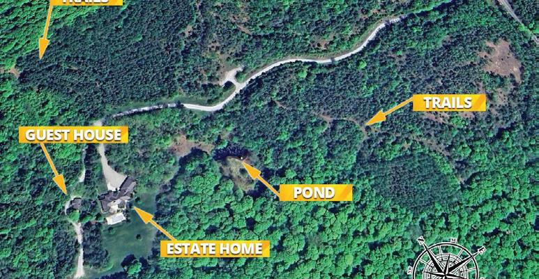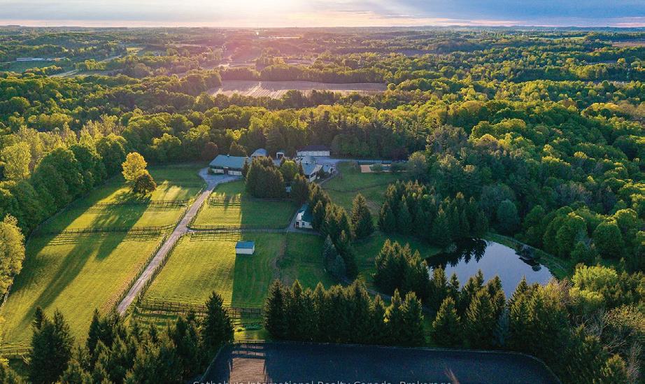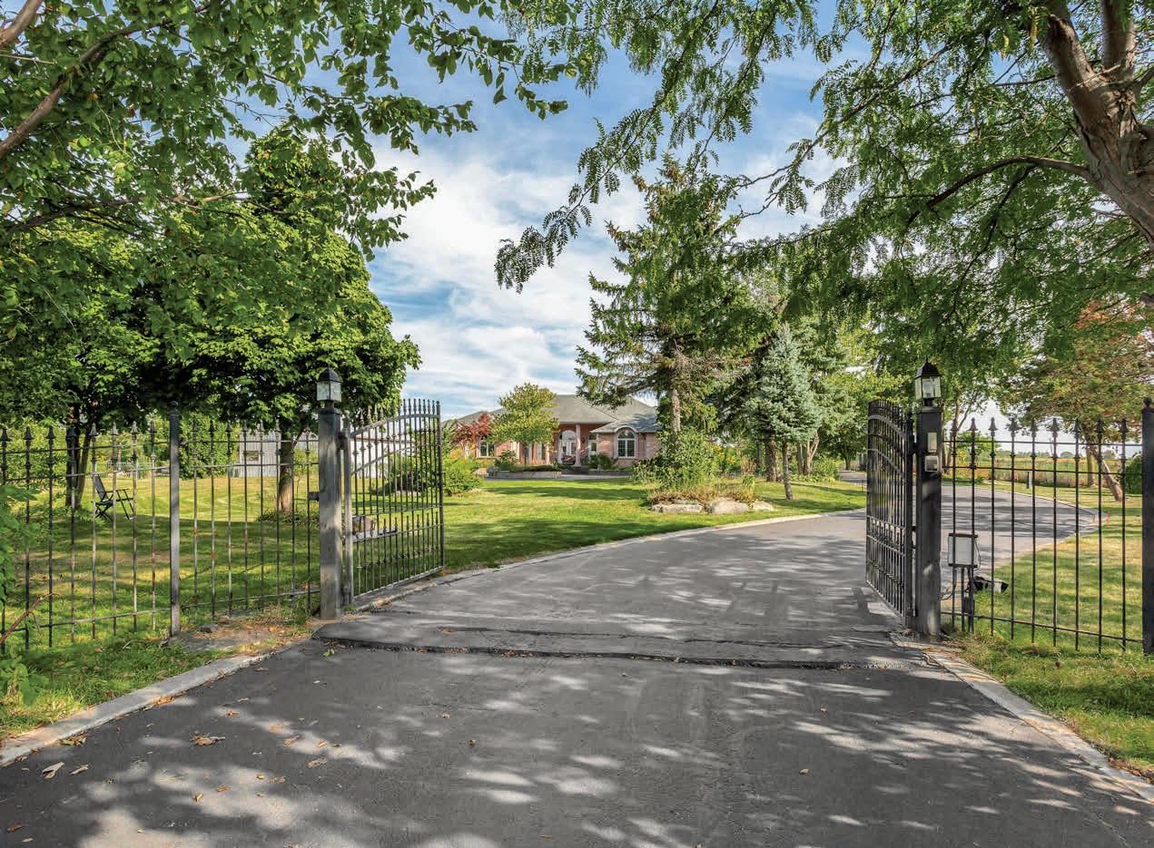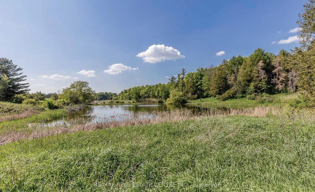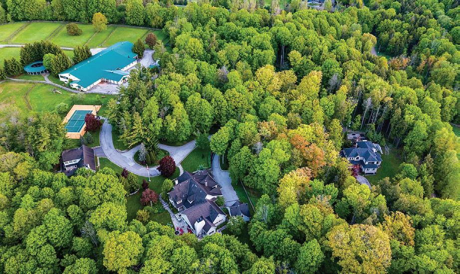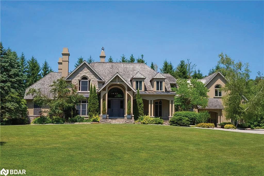 Welcome to this extraordinary private estate nestled on 92.15 acres of pristine forest, complete with a pond, stream, meadows and kilometers of private nature trails. A gated entrance framed by handcrafted Owen Sound stone pillars and wrought-iron gates leads to a winding drive and a secluded hilltop estate. Designed by an architect and built by Bristol Homes, this residence showcases impeccable craftsmanship with Owen Sound stone, copper accents, Indiana limestone window sills, and a 50-year Enviroshake roof ($275K). Inside, the grand foyer features heated slate floors and custom lighting. The formal living room boasts a stunning stone fireplace and arched windows, while the elegant library offers custom bookcases and solid wood finishes. The chef’s kitchen is both functional and beautiful, with granite counters, heated floors, a large breakfast bar, and camera monitors offering views of the gated entrance. The principal suite is a serene retreat with Brazilian mahogany floors, walk-out to the pool, and a luxurious ensuite. Two additional bedrooms share a well-appointed 5 pc.ensuite. The lower level is ideal for entertaining, featuring a theatre zone, games room, gym, sauna, and a state-of-the-art mechanical room. Outdoors, enjoy a heated saltwater pool, stone patio, and matching cabana with sauna and 100-amp service. The beautifully renovated separate 800 sq ft guest house includes two bedrooms and Loewen windows. A 1,500 sq ft four-bay garage offers 11-ft ceilings, radiant heating, and built-in sound. This rare offering combines total privacy with convenient access to Markham, Aurora, GO Transit, Hwy 407/404, and is just 50 minutes to Pearson Airport. This property is not just a home-it’s a Timeless Estate where Luxury and Nature Live in Harmony.