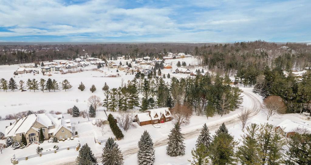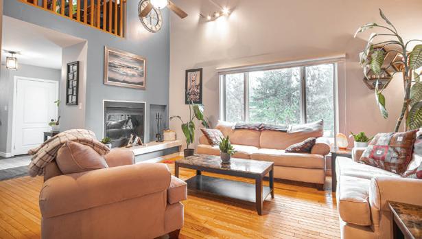Nestled on a large, private lot in a sought-after estate community, this stunning log home is surrounded by mature trees and offers a true fourseason lifestyle. With approximately 2,371 sq ft of finished living space plus additional space above the garage, the home features warm wood tones, hardwood flooring, and a gas fireplace with stone surround and timber mantle that create an inviting, chalet-like feel. The updated kitchen includes quartz countertops and newer stainless steel appliances, while the primary suite offers an updated ensuite with soaker tub, separate shower, and modern vanity. Upstairs, an open loft provides flexible space for a home office or reading nook, complemented by spacious bedrooms and treetop views. Thoughtful upgrades, including a newer furnace, 200-amp service, 18 new windows, cedar shake roof, large rear deck, and double garage with inside entry, complete this peaceful retreat designed for relaxed living in every season.