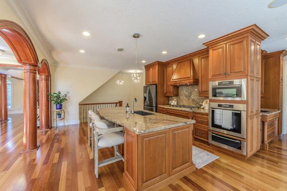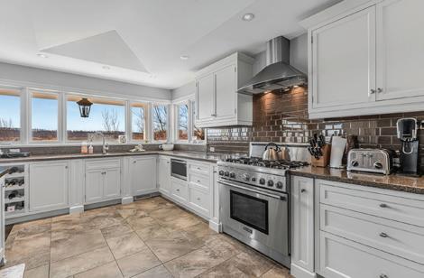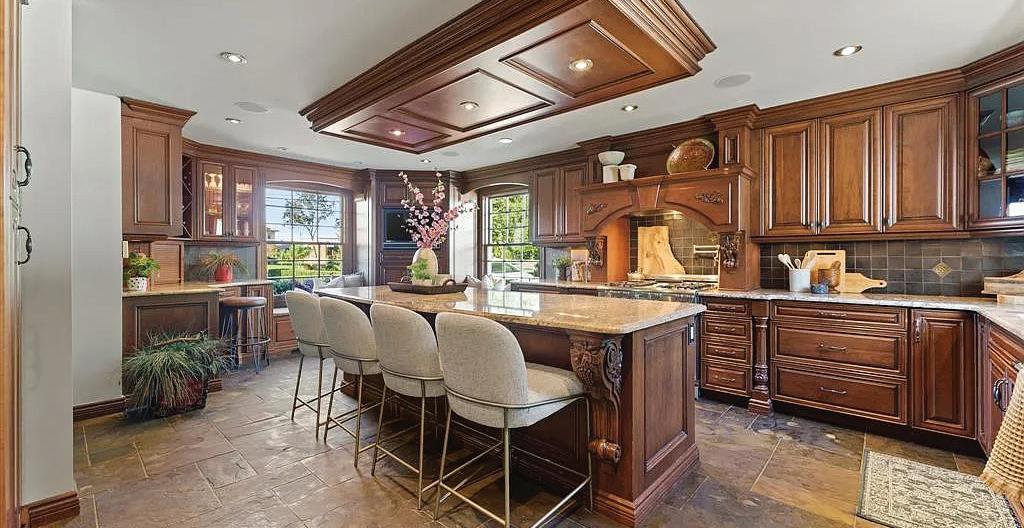 Pantry. Chefs Kitchen W/ 48 Wolf 8-Burner Stove, Pot Filler, Quartz Counters, Full-Height Cabinets, Custom Hood, Side-By-Side 33 Electrolux Fridge & Freezer, Bosch Dishwasher, Wine Fridge In Island, & Solid Wood Island W/ Sink. Custom Wine Rack In