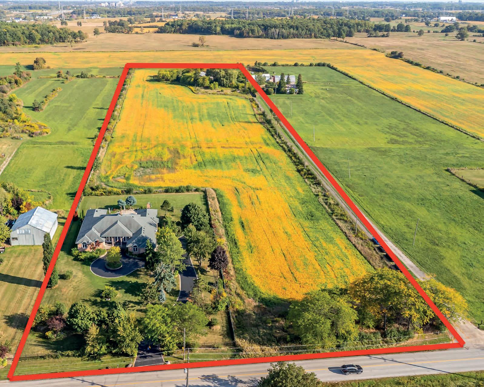 Discover an exceptional opportunity in one of Southern Ontario’s fastest-growing locations. This 12.37-acre single family property offers a rare combination of rural tranquility and prime development potential. Located directly across from the CN Logistics Hub and designated within the Future Strategic Employment Area (FSEA), it’s ideal for investors, developers, or businesses seeking strategic access to major transportation infrastructure. Nestled between Oakville and Burlington, the site enjoys excellent regional connectivity with easy access to Hwy401 and Hwy407. Surrounded by significant land holdings and future developments from Dundas Street to Britannia Road, the area is poised for transformation. Approved uses nearby include health and research facilities, long-term care, places of worship, automotive services, gas stations, institutions, and commercial buildings. Positioned between the planned expansion of Tremaine Road and Highway 25,the property offers unmatched visibility and access. Minutes from Milton’s university campus, the location benefits from proximity to educational infrastructure, enhancing its long-term value. The property features an expansive 8,200+ sq ft bungalow with 9 bedrooms, including 3 master suites. High ceilings and abundant natural light create an open, airy ambiance throughout the home. Enjoy spacious living and family rooms, a wood pellet fireplace, and second unused chimney offering potential for a double-sided fireplace installation. The open-concept kitchen with center island flows into the living area, complemented by a stylish bar between the dining and family rooms perfect for entertaining. A sunroom overlooks the backyard and inground pool, offering a peaceful outdoor retreat. Additional features include multiple barns and outbuildings for storage or redevelopment, a separate basement entrance with newly renovated porcelain flooring 2025,and updated mechanicals including a new furnace and water heater (2022).