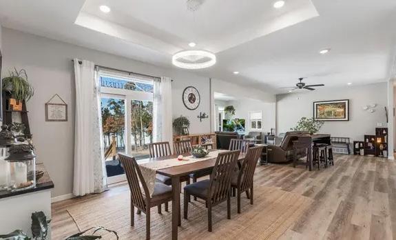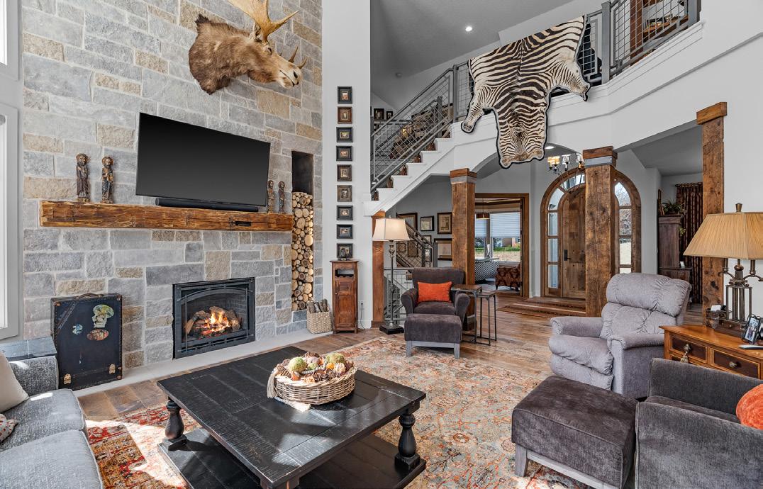 Nestled in a prime location, this exceptional two-story estate seamlessly combines the bold elegance of Western American Lodge design with the stunning beauty of its natural surroundings. Every inch of this remarkable home has been meticulously crafted and thoughtfully updated to create a breathtaking living space that radiates both luxury and warmth. Upon entry, you are welcomed by a custom-built primary doorway that sets the tone for the entire home. The striking, on-site fabricated iron staircase railings and catwalk serve as an artistic focal point, blending intricate design with functionality. A majestic two-story, floor-to-ceiling fireplace adds grandeur and sophistication to the space, drawing the eye upward and creating a perfect setting for relaxation or entertaining. The home’s attention to detail is evident in every room, from the new reclaimed wood flooring throughout to the custom cabinetry, sleek countertops, and high-end appliances. Each element has been carefully chosen to complement the home’s distinctive style and enhance its luxurious feel, all with the exclusive Antelope touch. The grandeur of the estate is further exemplified by magnificent vaulted ceilings that soar through the foyer and expansive great room, offering an open and airy atmosphere. With access to Pleasant Lake through a private trail and seasonal lake views, the secluded backyard serves as a serene retreat, offering privacy, tranquility, and unparalleled beauty. Whether you are seeking an elegant space to entertain or a peaceful sanctuary to call home, this estate offers the ideal setting. The meticulous updates and exceptional craftsmanship make it a must-see property for those in search of a one-of-a-kind living experience.