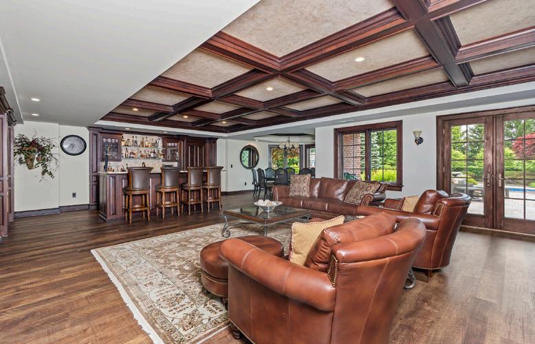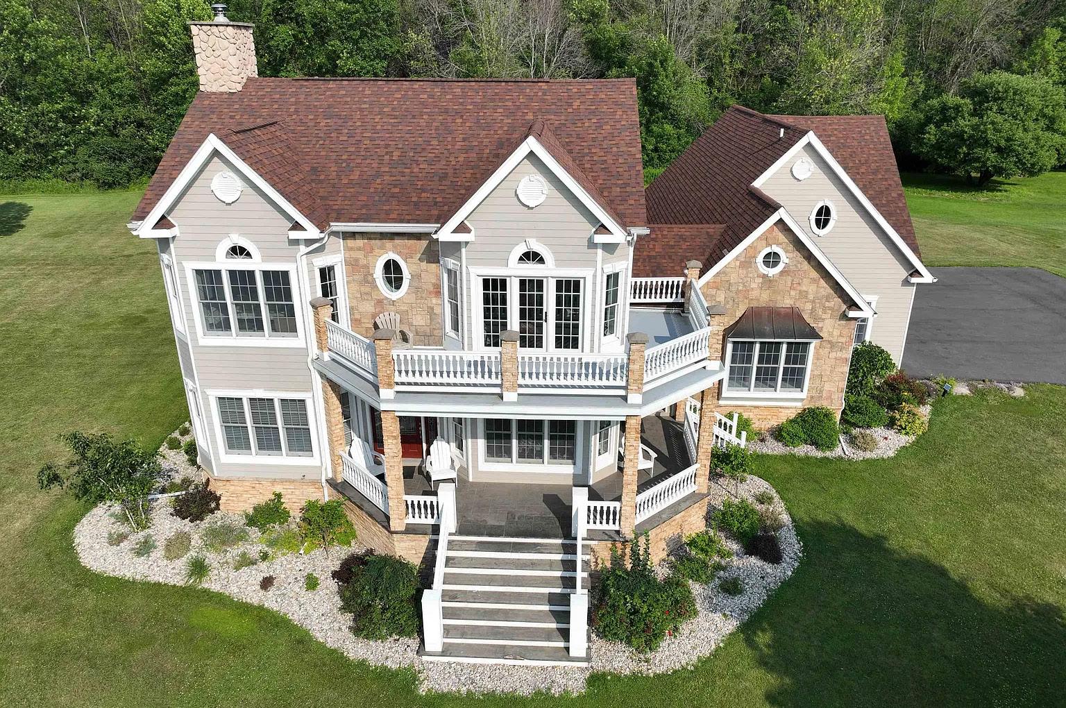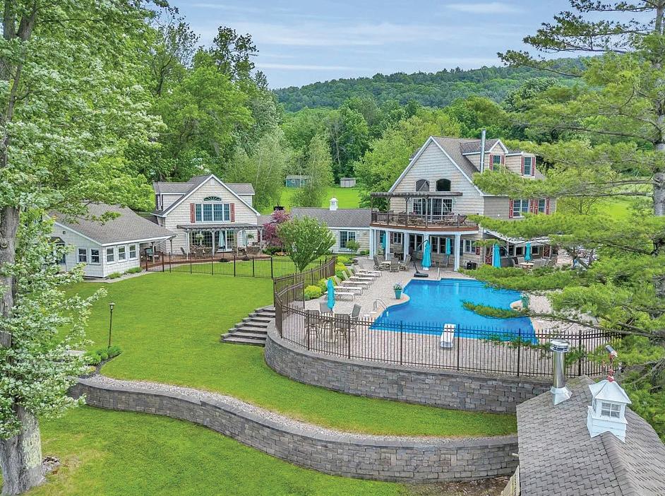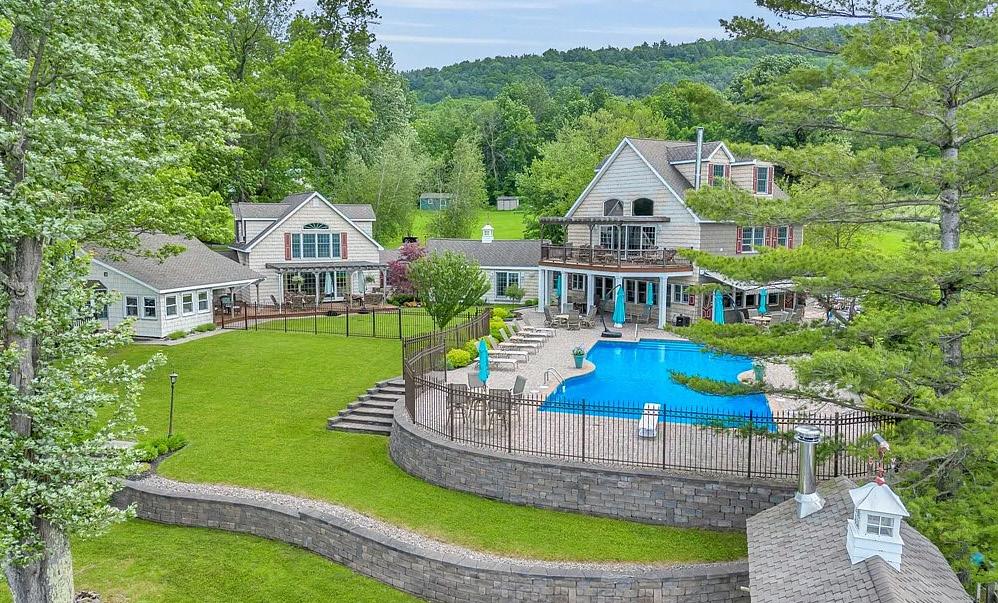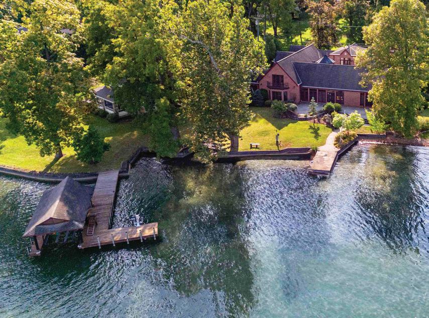 Spectacular year-round lakefront retreat with 150+/- feet of private shoreline and nearly 6,000 square feet of luxurious living space. Perfectly positioned with an oversized inground heated pool between the home and the lakefront, this masterpiece is designed to impress at every turn. Eloquently styled and masterfully crafted, this extraordinary home features two complete living quarters— ideal for extended family, entertaining guests, or potential B&B use. The interiors boast impeccable oak and maple woodwork, Wood-Mode and Brookhaven built-ins and cabinetry, solid quartz and marble countertops, copper sinks, designer bath and light fixtures, custom drapery and blinds, marble-accented gas fireplaces, a bluestone wood-burning fireplace, and a stunning glassenclosed wine room.