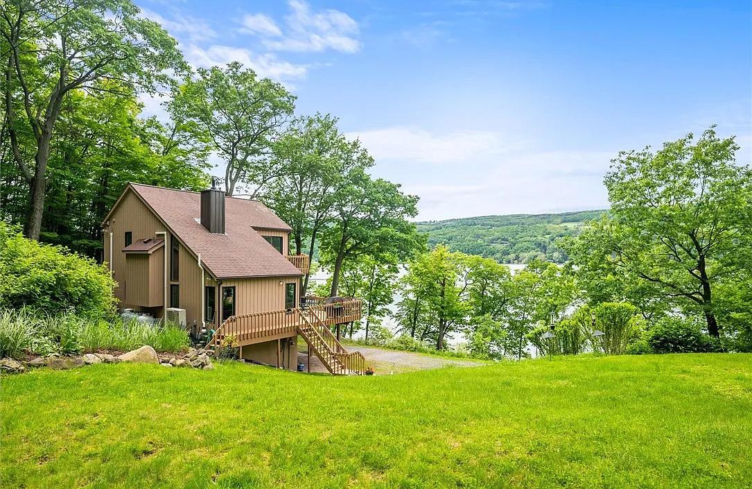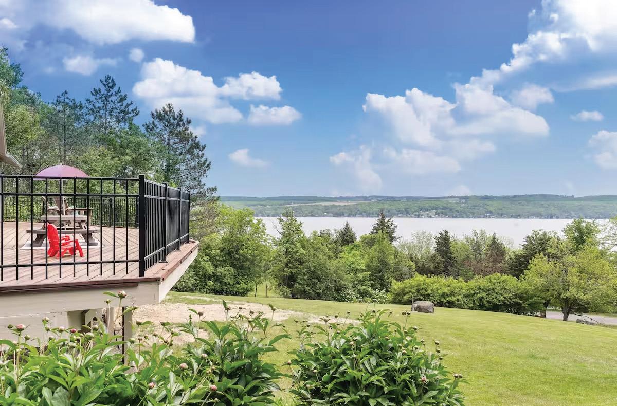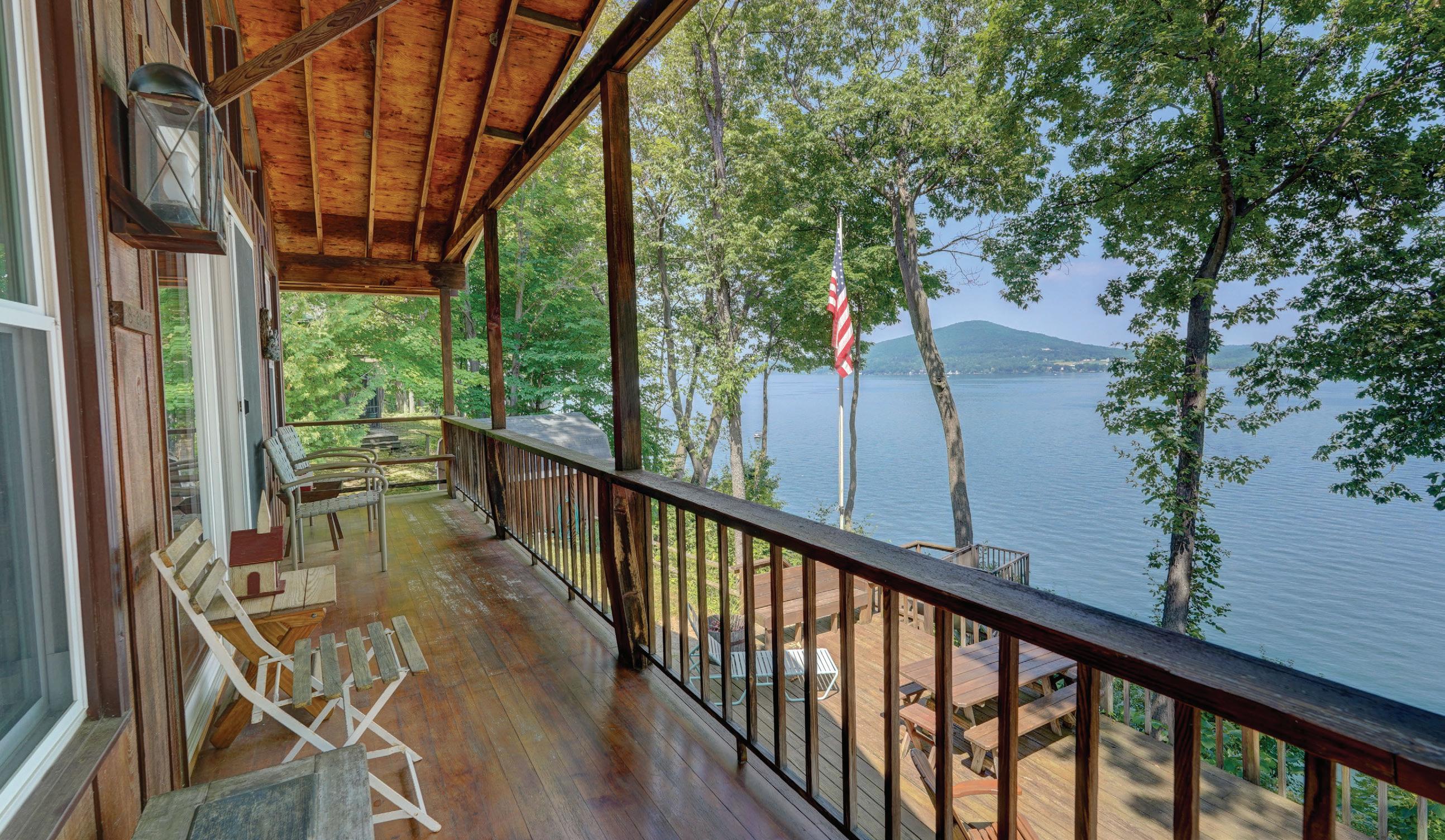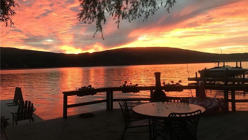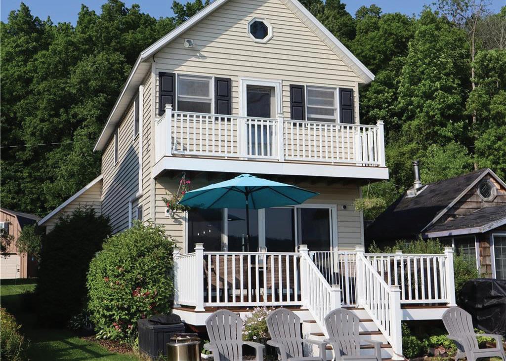 Privacy, expansive lake frontage, and modern living all rolled into one! This one of a kind property on Canandaguia Lake boast 330 feet of lake frontage, 7.8 acres of private land, and a house that has been updated and cared for by the same owners for the last 18 years. The expansive beach front features 2 docks, a boat hoist, and a large deck that is perfect for entertaining, enjoying the water, and jaw dropping sunsets. Inside the home enjoy the open floor plan, new picture windows, and sliding glass doors that provide breathtaking views of the lake from every corner of the house. Relax and unwind with friends and family on the main deck overlooking the lake, or enjoy the same view from the hot tub on the secondary deck off the primary suite. The first floor includes a primary suite, updated eat in kitchen, a separate dining area, an updated full bathroom, gas fireplace, cathedral ceilings, and hardwood floors. The second floor features two large bedrooms, a full bathroom, and a sliding glass door that walks out onto a balcony overlooking the lake.