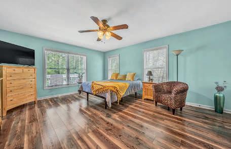 The spacious Great Room also features a vaulted ceiling and a floor-to-ceiling stacked stone chimney with a vented gas fireplace, one of two in the home. Step outside to a massive deck with an electric remote awning, or retreat to the lower-level covered patio—both perfect for relaxing or entertaining lakeside. This level offers ideal space for a private MIL suite with 9’ ceilings, a second gas fireplace, and abundant natural light from the four Anderson sliding glass doors (eight total throughout the home).