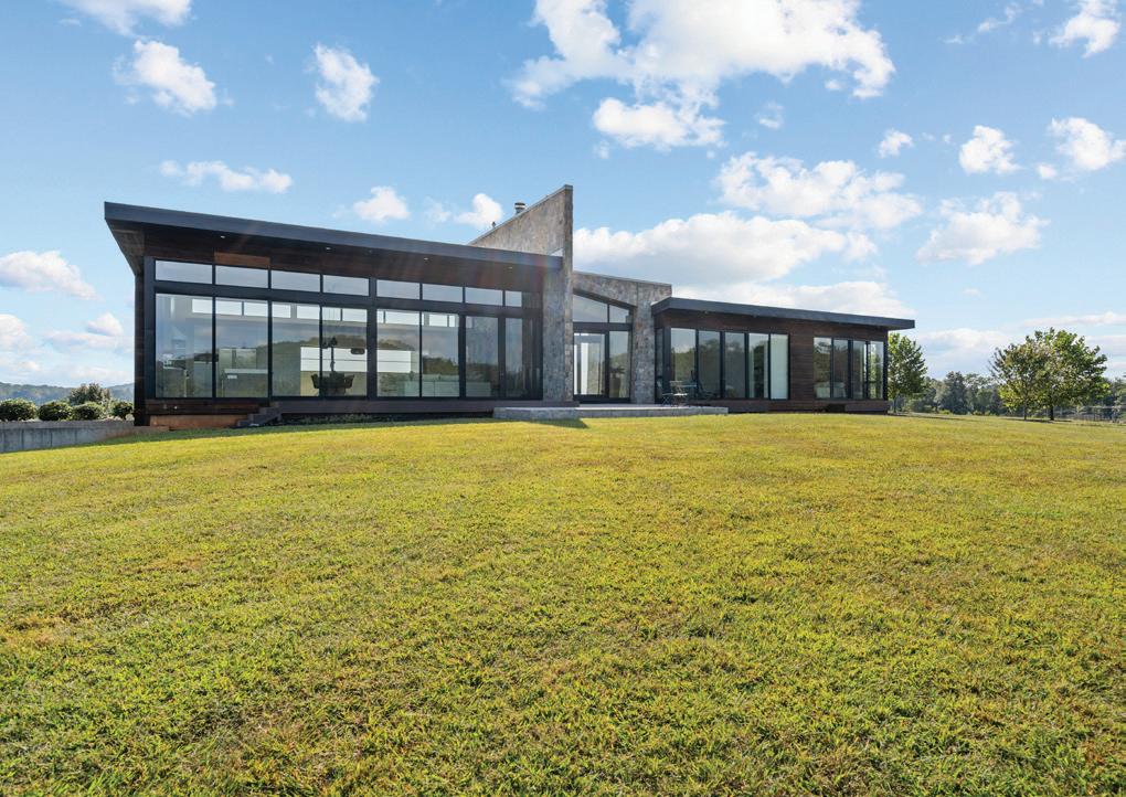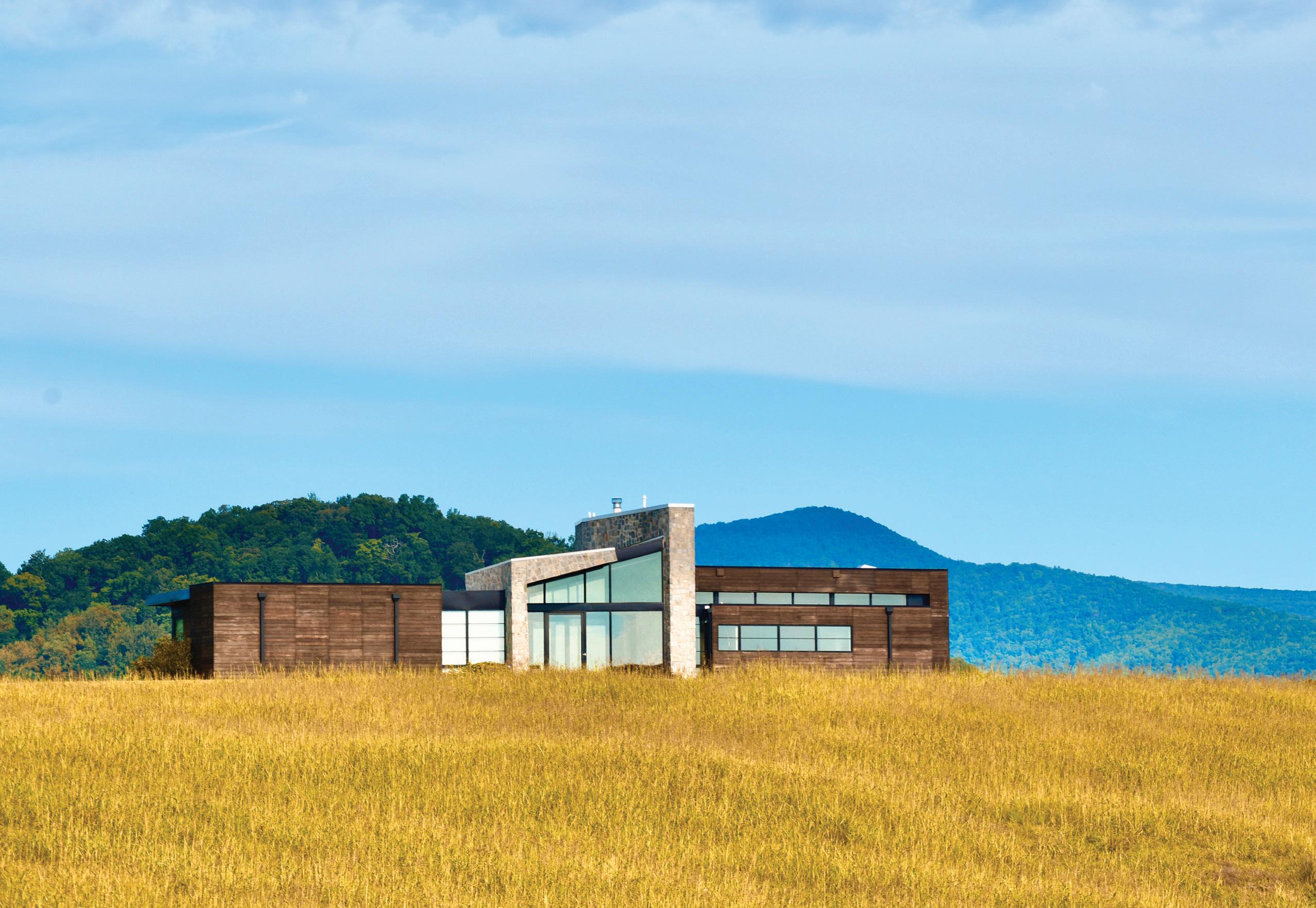 Amidst rolling hayfields and sweeping mountain views, House of Sky is a modern retreat designed for serenity and connection to nature. The striking stone-and-wood exterior opens to expansive western windows framing the Blue Ridge horizon. This 2 BR, 2.5 BA retreat on 52.89 acres blends seamlessly into its landscape with expansive glass walls and terraces that frame the horizon. The open kitchen, dining, and living space features 15’ ceilings, white oak floors, custom cabinetry, and top appliances. The primary suite offers floor-to-ceiling windows, a spa-like travertine bath, and a generous closet. A second en-suite bedroom has floor-to-ceiling windows and includes two stone built-in bunks. The home blends artistry with function with features including: private library, wine cellar, walls of glass and an oversized attached garage. Located in Rappahannock County, near the Shenandoah National Park, and about one hour from Washington, DC.
