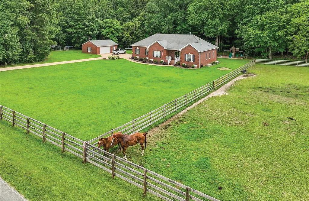 This meticulously maintained single-level home spans 2,509 square feet and is nestled on a sprawling 7 acres of picturesque land. It features a 3-stall center-aisle barn, complete with a hot and cold water wash stall, tack room, hayloft, and matted stalls. The property boasts three beautifully kept pastures, each equipped with electricity and water for convenient horse care. There is ample space for additional pasture or multiple riding areas, making it a dream come true for equestrian enthusiasts. After a long day, you can relax in the outdoor space or spend the evening entertaining on the back deck, which is enhanced with a retractable awning, a charming pergola with outdoor fans, and a sparkling swimming pool. Embrace the beauty of country living while enjoying the convenience of being just 10 minutes from downtown Suffolk, with access to a reliable internet connection with wired fiber optics. If you desire even more space for expansion an additional 8-acre parcel is available for purchase.