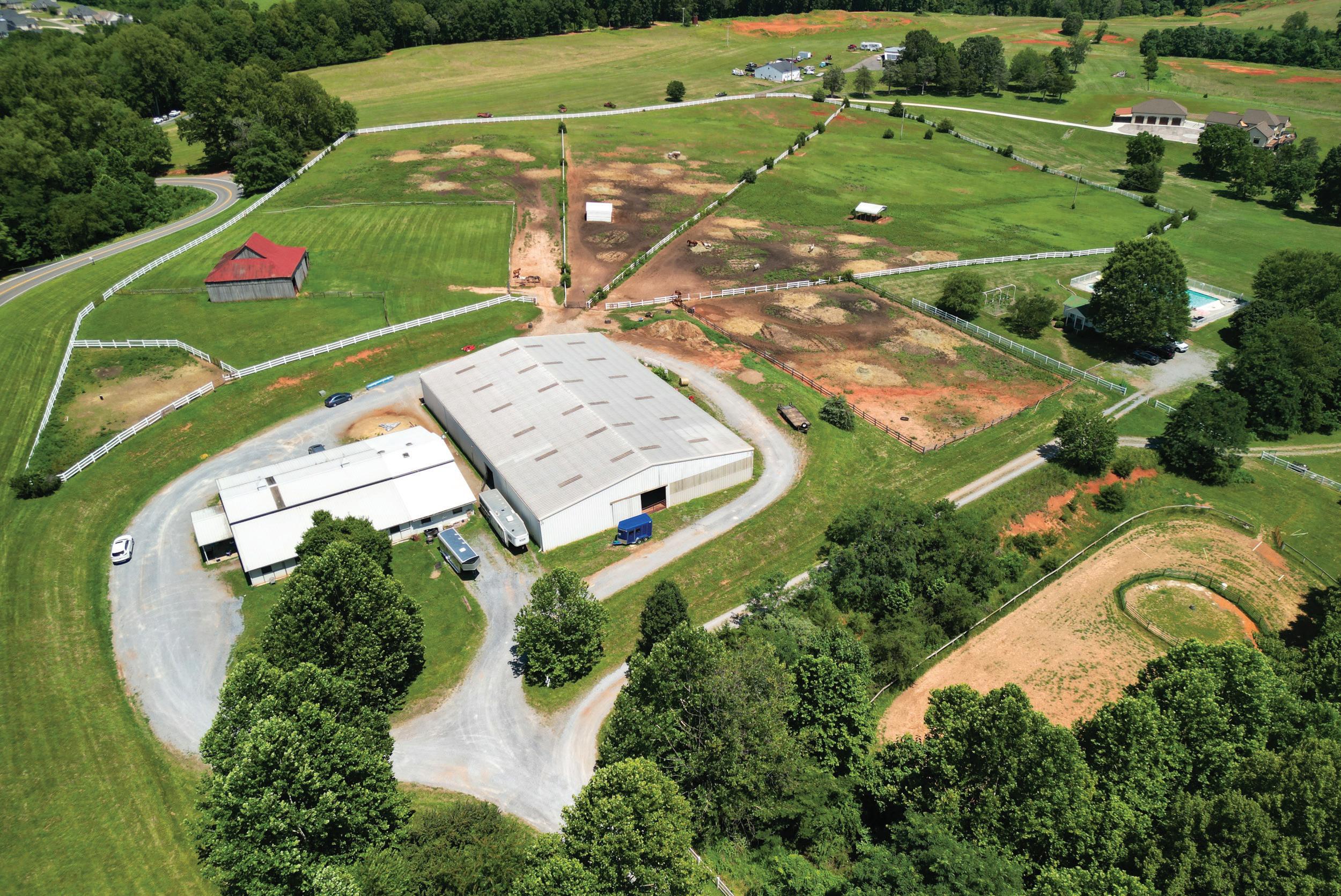 Features include a ten-stall barn with tack, feed, and storage rooms plus a half bath, a lighted riding ring for lessons or evening training, and two additional sheds.