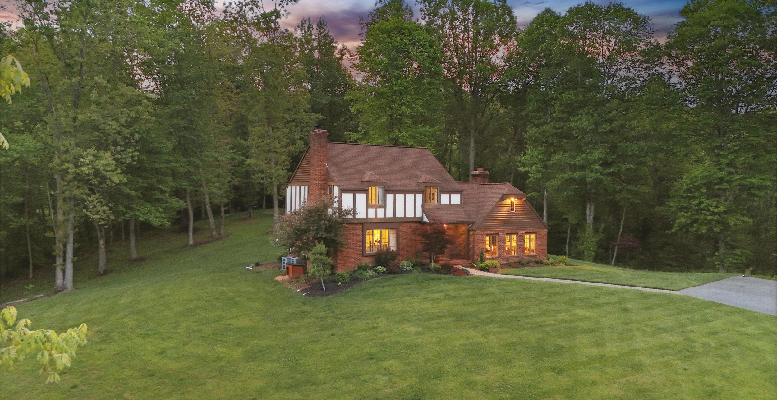 Step into timeless elegance with this beautifully appointed English Tudor that seamlessly blends classic charm with modern luxury. The main floor boasts a generous primary suite featuring a luxurious steam shower—your private spa at home. The chef-inspired kitchen is a showstopper, outfitted with updated cabinetry, gleaming granite countertops, a Wolf range, and a Sub-Zero refrigerator—perfect for entertaining or indulging your culinary passions. Sunlight floods the inviting living room through expansive windows, highlighting a cozy gas fireplace—ideal for relaxing evenings. A spacious dining room offers plenty of room for gatherings and celebrations. Upstairs, you’ll find four additional bedrooms, including a second primary suite, offering comfort and flexibility for family or guests. Outside, the property is just as captivating. Enjoy evenings around the fire pit, host gatherings on the concrete patio, or take in the beautifully landscaped grounds. A detached garage adds functionality, while the setting offers exceptional privacy, yet remains just minutes from town. With approximately 4 acres, you will have tons of space, and additional acreage is available to purchase separately.
