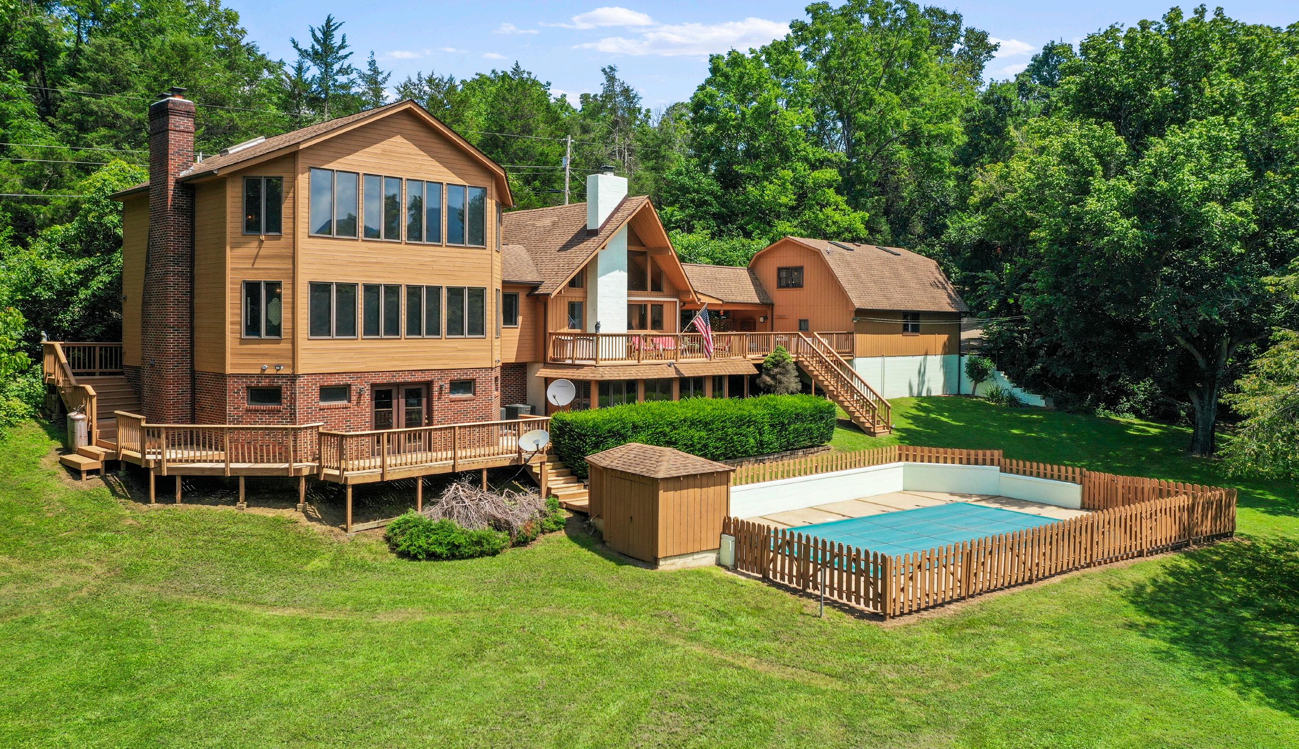 2 BEDS • 2 BATHS • 3,162 SQFT • $595,000 . This well maintained home on 5.90 partially wooded acres, offers peace and tranquility. A great place to wind down any busy day. Entertaining on the spacious poolside decks, perhaps taking a dip into the above ground pool or just sitting on your front porch to watch the wildlife. Busy life... this home offers space for relaxing and working with the extra room on the upper level, or the office space on the lower level. This is a must see! The 3 outbuildings all have electric service. The detached garage and adjoining shop both have heat lamps. The shop is also insulated to help keep you warm when working in the cold. Bring your desires for at home activities to their own special spacious place. Plenty of space, endless opportunity. The Gas Furnace was replaced in 2023. Hot water tank, Welltron, Water Conditioner, Water Drip Filter for Iron and New Garage Door opener all replace around 2022. Need some pool furniture, we’ve got you covered. Ask about what conveys. This pool is ready for entertaining. All operating equipment and supplies convey.