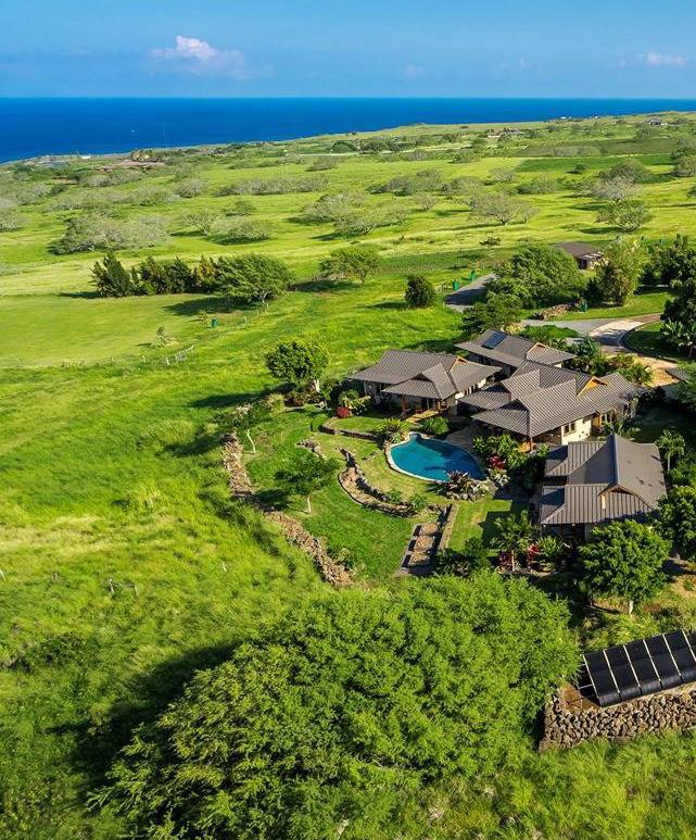 Situated on 21+ fully fenced acres of mature landscaping, provides incredible privacy for this pod-style enclave. Consisting of four detached, air conditioned, living areas nestled within a tropical island setting, the architecture is modern, island ranch-style with large roof overhangs, a stucco exterior and partial lava wainscoting. An expansive covered lanai and gas firepit, ideal for outdoor living, dining, and entertaining, overlooks a heated pool and the spectacular ocean, year-round sunsets, and Maui views. Feel the magic!