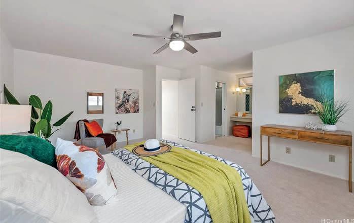 $3,100,000 | Modern, luxury living at the serene and stately Koko Villas in beautiful Hawaii Kai; just minutes to Shopping, Golf Course, Sandy Beach, Botanical Gardens, and Koko Head Crater. This updated tech-smart, single level family home is spaciously designed with 10-foot ceilings and central AC, featuring 3 bedrooms, 3 baths and an extra bonus (French-door enclosed) office den or guest suite to use as a 4th bedroom. Recent upgrades include an electrical system with tastefully designed California Closet systems in the primary walk-in, elegantly back lit entertainment center and credenza storage cabinet, owned 65-panel Tesla Power Photovoltaic system save on electricity bills, a 2-battery powered Tesla charging receptacle ready for your eco-friendly electric vehicle, new solar water heater, EPLO smart toilets in all 3 bathrooms, full sized Electrolux built in refrigerator/freezer and Sub Zero beverage chilling cabinets, Jennair convection oven and microwave, new window screens throughout and tropical design window panes for privacy, heated in-ground pool and new Sundance whirlpool spa; perfect for entertaining. Furnishings also available, offering Buyer’s the option for a seamless move-in!