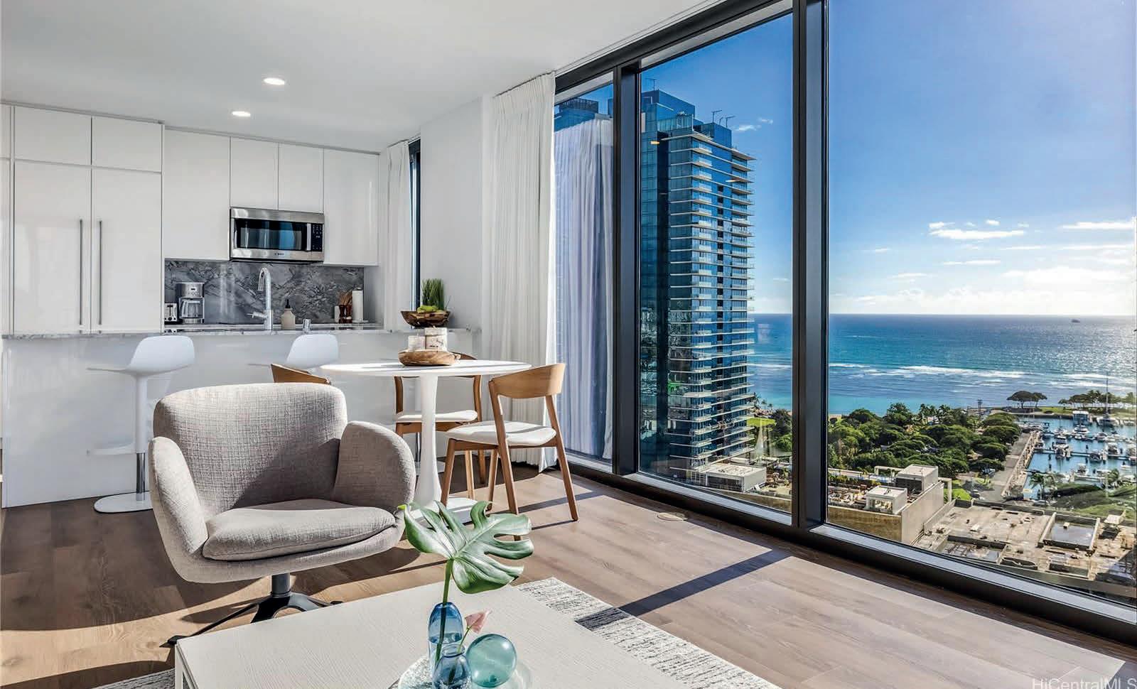Experience this warm and well-cared-for unit in Kapiolani Bel-Aire. Enjoy its prime location in proximity to the world’s largest open-air shopping center, popular food markets, delicious eateries, and the ever-famous Waikiki beaches. Entering the home, you’ll immediately be struck by floorto-ceiling windows that display breathtaking, panoramic views of majestic lush mountains and the evening’s twinkling city lights. Upon moving through the home, you’ll notice the ample counter space in the newly renovated kitchen that includes upgraded appliances and a wine chiller. Perfect for an evening of entertaining or hosting guests. Moving toward the back, you’ll be able to enjoy a peaceful lanai while being greeted by soft tropical breezes. This move-in-ready home has new electrical updates, new recessed lighting and a fresh, uplifting paint coat. Best of all? It’s is pet friendly (please verify). Act fast to view this incredible home in person.