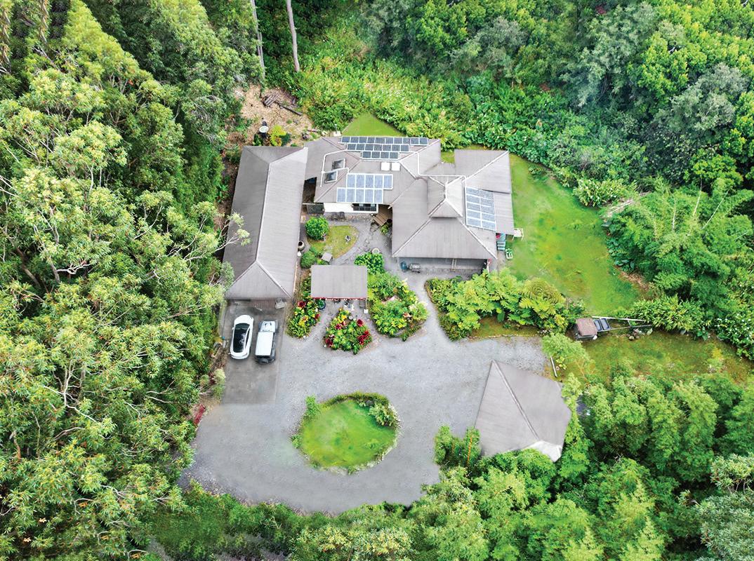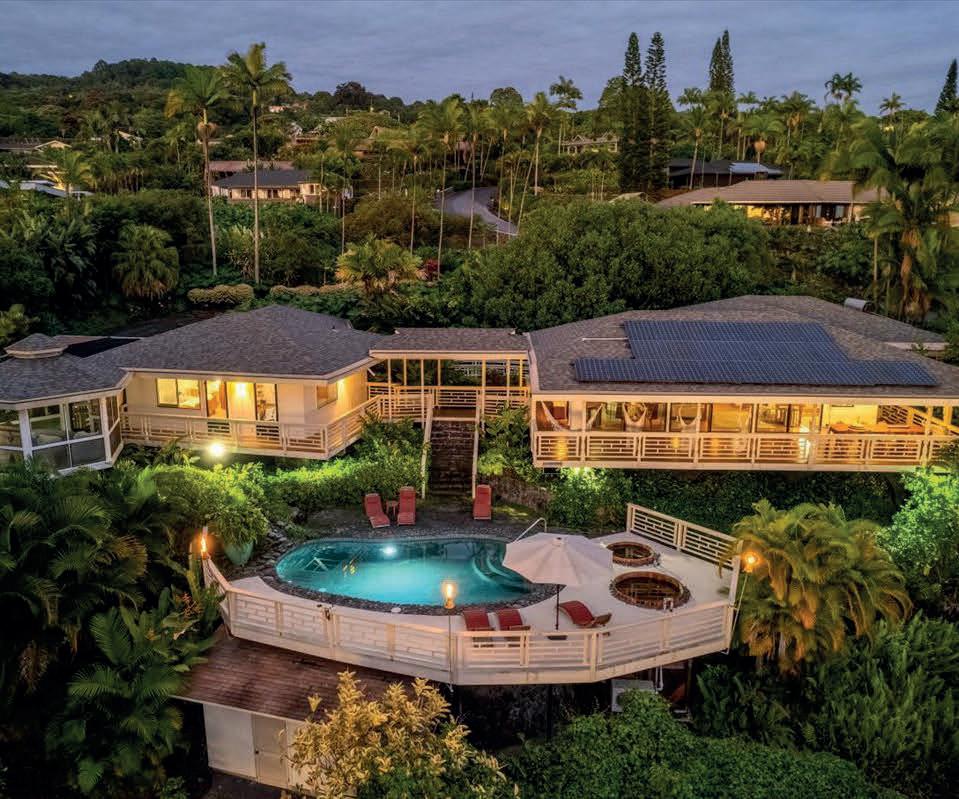 ZEN HOUSE: Custom-built in 1992, the 2,106 sq ft offers a spacious, high open-beam living area with 2 BR, 1 full BA, 1 ¾ BA, & 1 ½ BA. It includes a full kitchen, office, entertainment, dining & living room with a ctrl. natural Ohia tree post. Features include skylights, gas fireplace, ctrl. dehumidifier, 10KW solar system, & electric car charge station. The entry boasts a large 19th-century antique hand-carved mission door. The 800 sq ft Master BR en suite ft. natural bamboo floors, shoji doors, a custom double vanity with granite countertops, a Japanese Furo, a large tiled walk-in shower, & walk-in closet. The kitchen