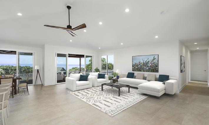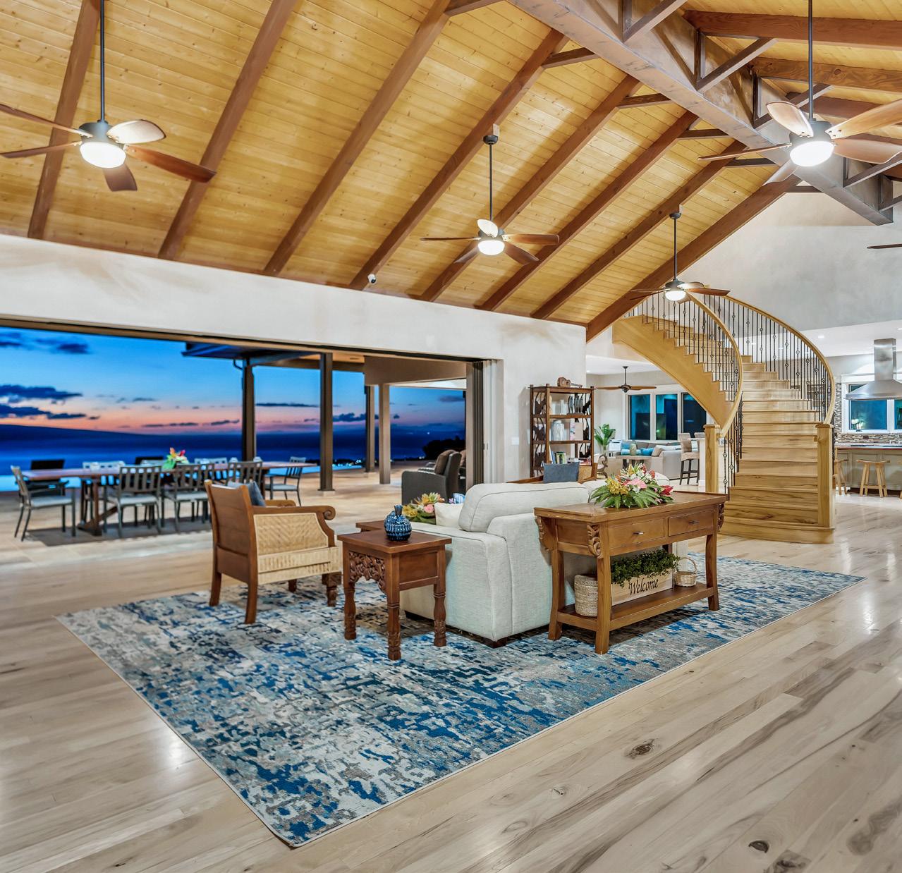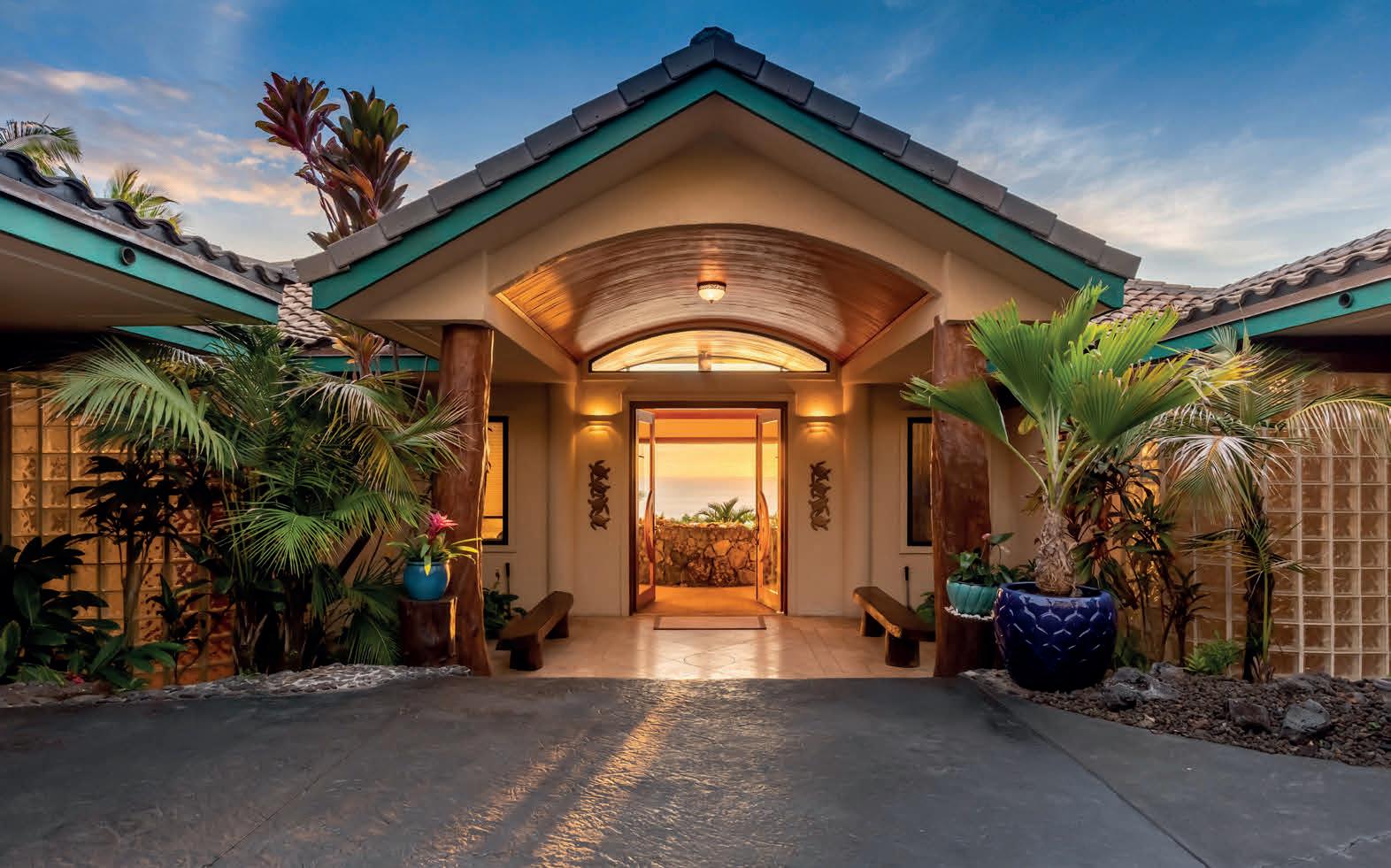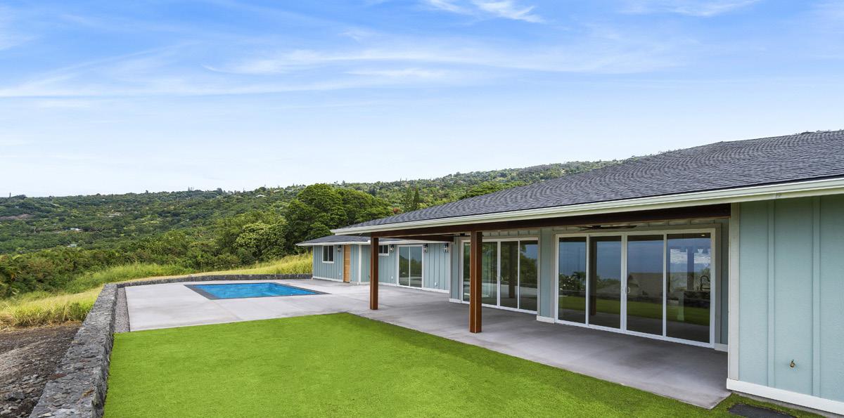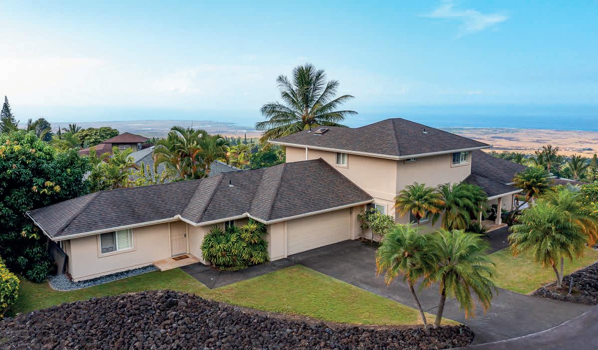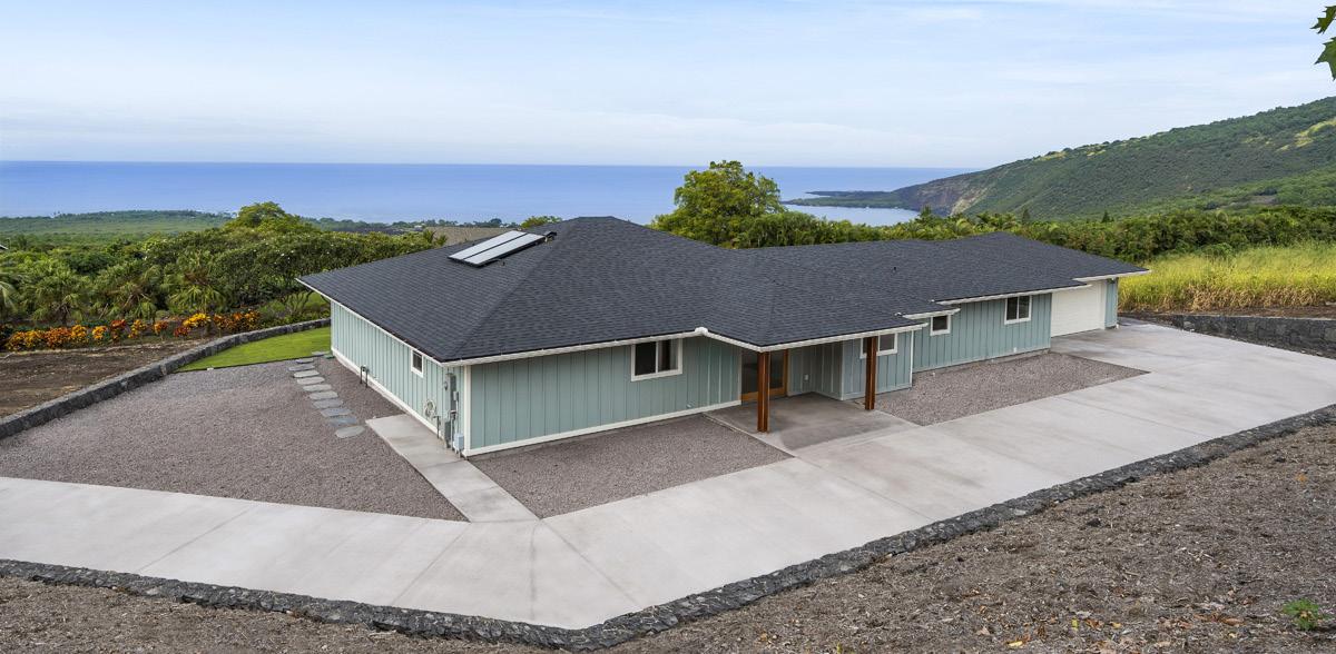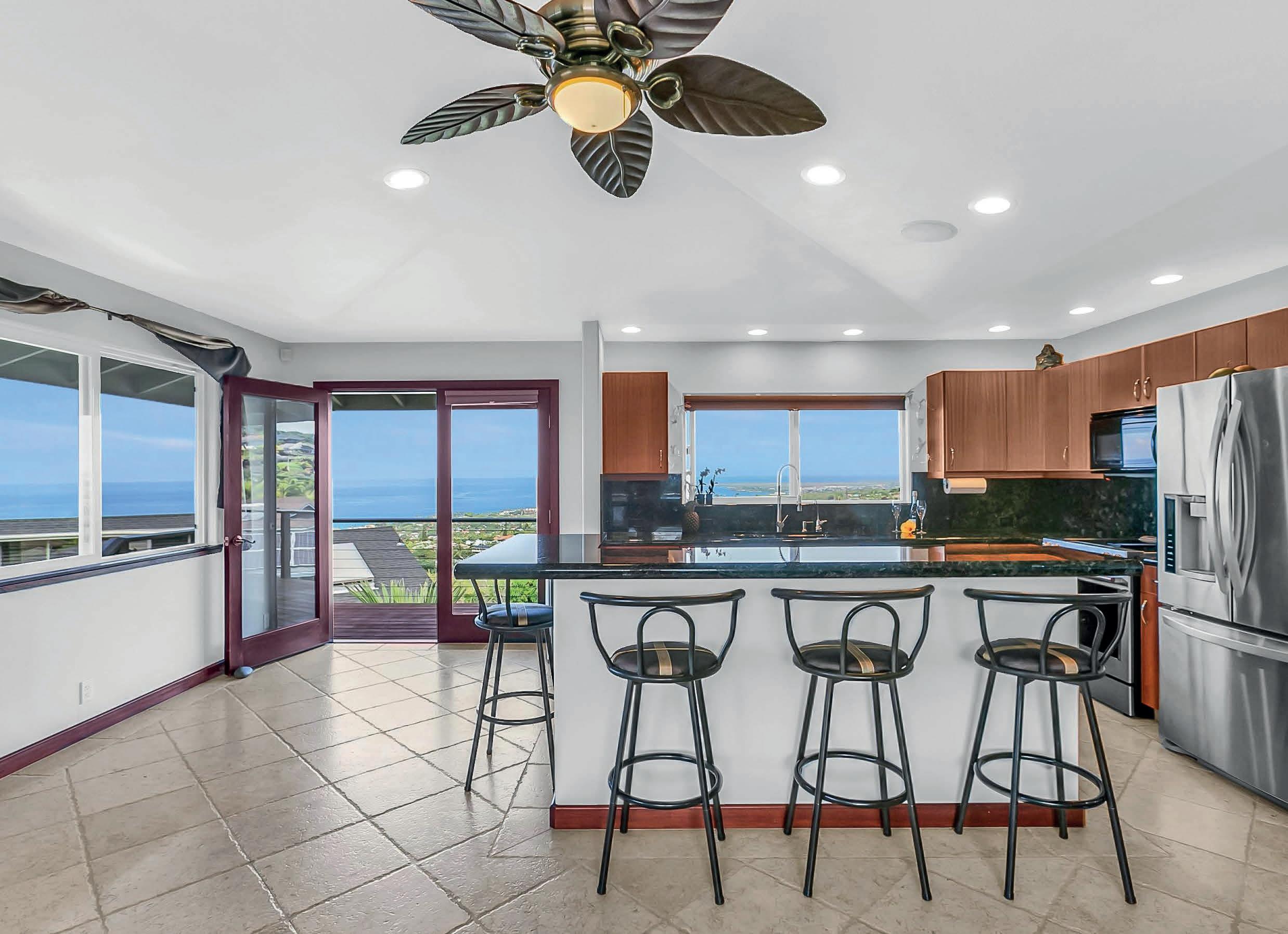 4 beds | 3 baths | 2,556 sq ft | $2,195,000. Amazing ocean and mountain views abound from this custom-built single story 4 bedroom 3 bath home, designed to capture Hawaiian indoor/outdoor living. Enter the home and walk into the open concept great room with vaulted ceiling that opens to a covered lanai and pool area. The house features an open kitchen and large island that flows into the dining room and living area. Kitchen Aid appliances, Quartz counter tops and Bellmont Velluto cabinets. Located off of the kitchen is a large multi-use chef’s office/pantry. Coem Loire Italian porcelain flooring throughout the home. The South wing encompasses the large primary bedroom with en suite, (double sinks, walk in shower, free standing soaking tub) walk in closet, vaulted tray ceiling and access to covered lanai and pool. The North wing has three additional bedrooms- a junior primary bedroom with en suite (double sinks and walk in shower), a guest bedroom with doors leading to the pool, and a fourth bedroom- as well as a full hall bath and a mudroom with laundry and storage located just off of the two-car garage. This home is located on over 1.2 acres, in a private and gated community and within 30 minutes of downtown Kailua-Kona. Enjoy cool breezes at the 750 foot elevation overlooking historic Kealakekua Bay and marine sanctuary.
