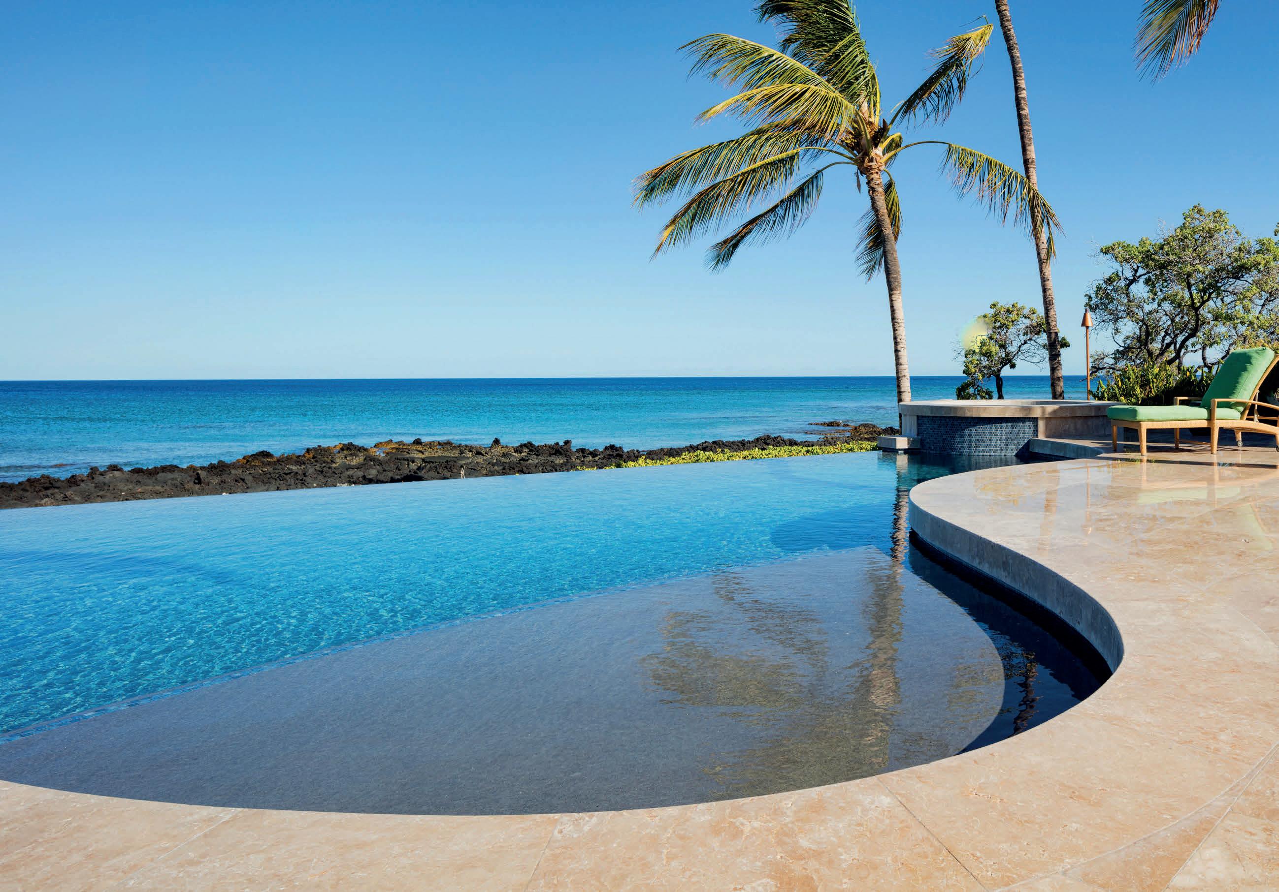On the shores of Anaeho’omalu Bay on the Big Island of Hawai’i, punctuated by ancient fishponds and turquoise waters, lies Pacific Sunset Villa, a chance to steward an iconic piece of the Hawaiian coastline. Life here is oceanfront luxury as you lose sense of where the Pacific ocean starts and the infinity pool ends. The drama of the ocean out front is the reason adventurers and lovers of beauty have always made their way to these islands. Panoramic views from the second-story observatory nook begin your mornings by watching the surfers paddle out and the dolphins swim by. In season you can see and hear the humpback whales playing in the Bay, while you breathe in the beauty of an iconic sunset. World class restaurants are a stroll away, and then, once you arrive back home, catch a glimpse of an erupting volcano or the milky way galaxy. No detail was spared in this almost 5,000 square foot open floor plan home featuring four bedrooms, an office, media room, private hale, two-car garage, dedicated bar, and outdoor dining. Located in a private 12-lot subdivision, this home says relax and unwind, and discover why so many love life on the Big Island.