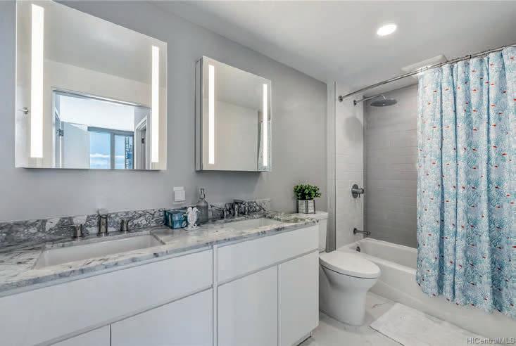 PRICED AT BELOW AVM VALUE. EASY WAY is to Buy this NEWLY RENOVATED unit from top to bottom & sell yours. Save time & money. Well lighted corner unit with ocean/sunset view from living room and bedrooms. Spacious 01 layout. New stylish kitchen cabinets, elegant granite countertops and matching island. High-tech front door smart lock with keypad and smart phone access. Speaker-lights play music in both bathrooms and above the kitchen island. Luxury bidet in master bathroom with warm water and seat features. Streamlined bidet in 2nd bathroom. Artistic river-blue granite back splash with waterfall-look to match the kitchen countertop and island. Large kitchen island seats on all 4 sides like a grand dining table/conference table, or as your office/residence. Enjoy the panoramic ocean view from kitchen island or living room. Spacious and well-kept amenities. Harbor Tower is a luxury condo in convenient locations to restaurant and businesses. Minutes to your office, Safeway, Longs, Post Office, banks, YWCA. 24 hours security. Corner units with this #01 layout are rarely available for sale. Enjoy the spectacular sunset/ nighttime views! Check out Immoviewer Video, or Come to Open house. MLS#202219417.