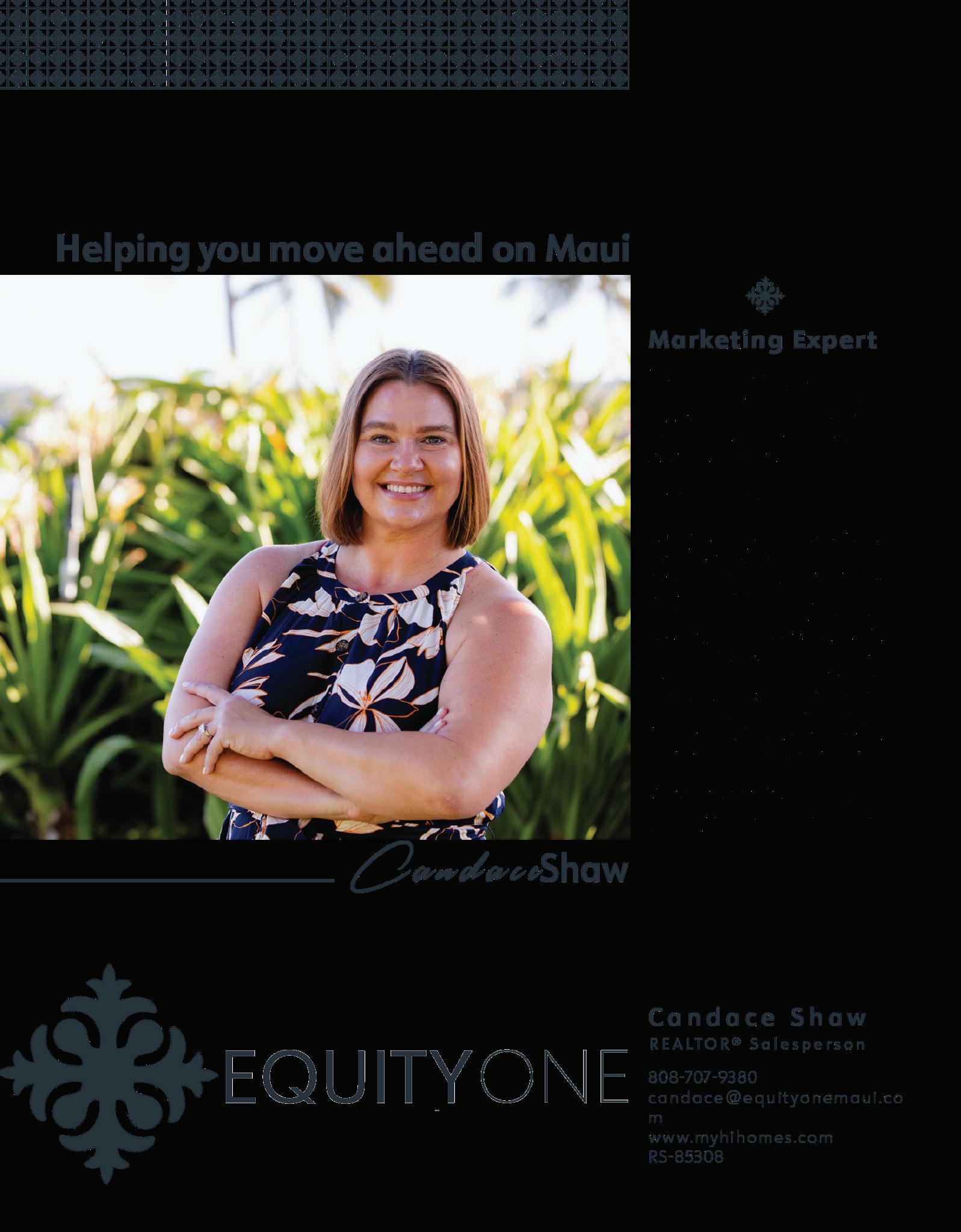 RECENTLY SOLD KAPALUA RIDGE #724 Sold for $1,275,000 64 WAI KULU PLACE UNIT A Sold for $2,950,000 Mya AwaiREALTOR ® SALESPERSON RS-80678 808.344.4212 mya@equityonemaui.com www.mauionthemarket.com IL V E Y OUR BESTBEAC H LIFE! THERE HAS NEVER BEEN A MORE IMPORTANT TIME TO LOVE WHERE YOU LIVE...