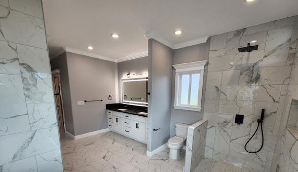 Upper Level: 2 primary bedrooms with en-suite baths, powder room, and open living room/kitchen.