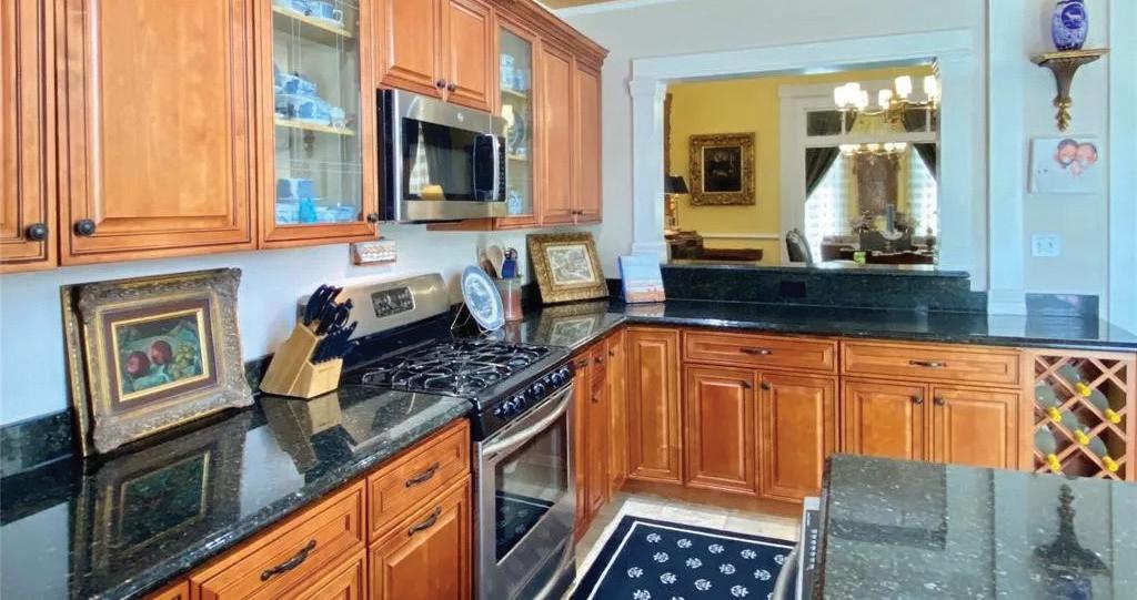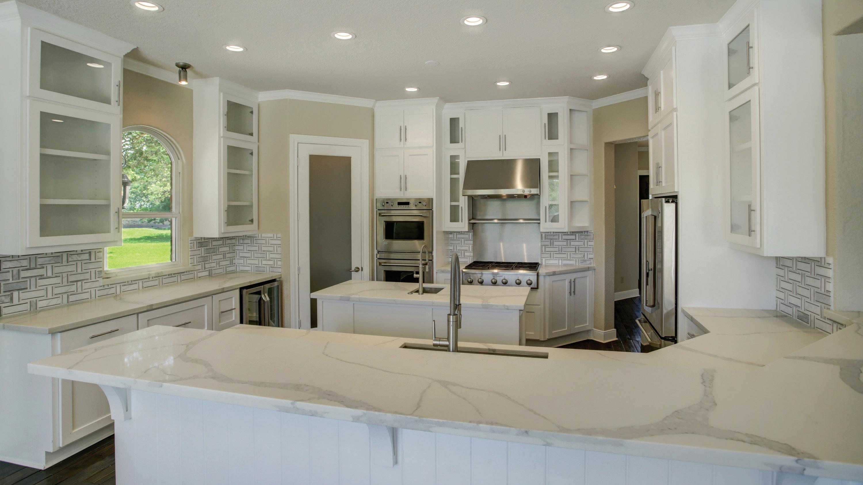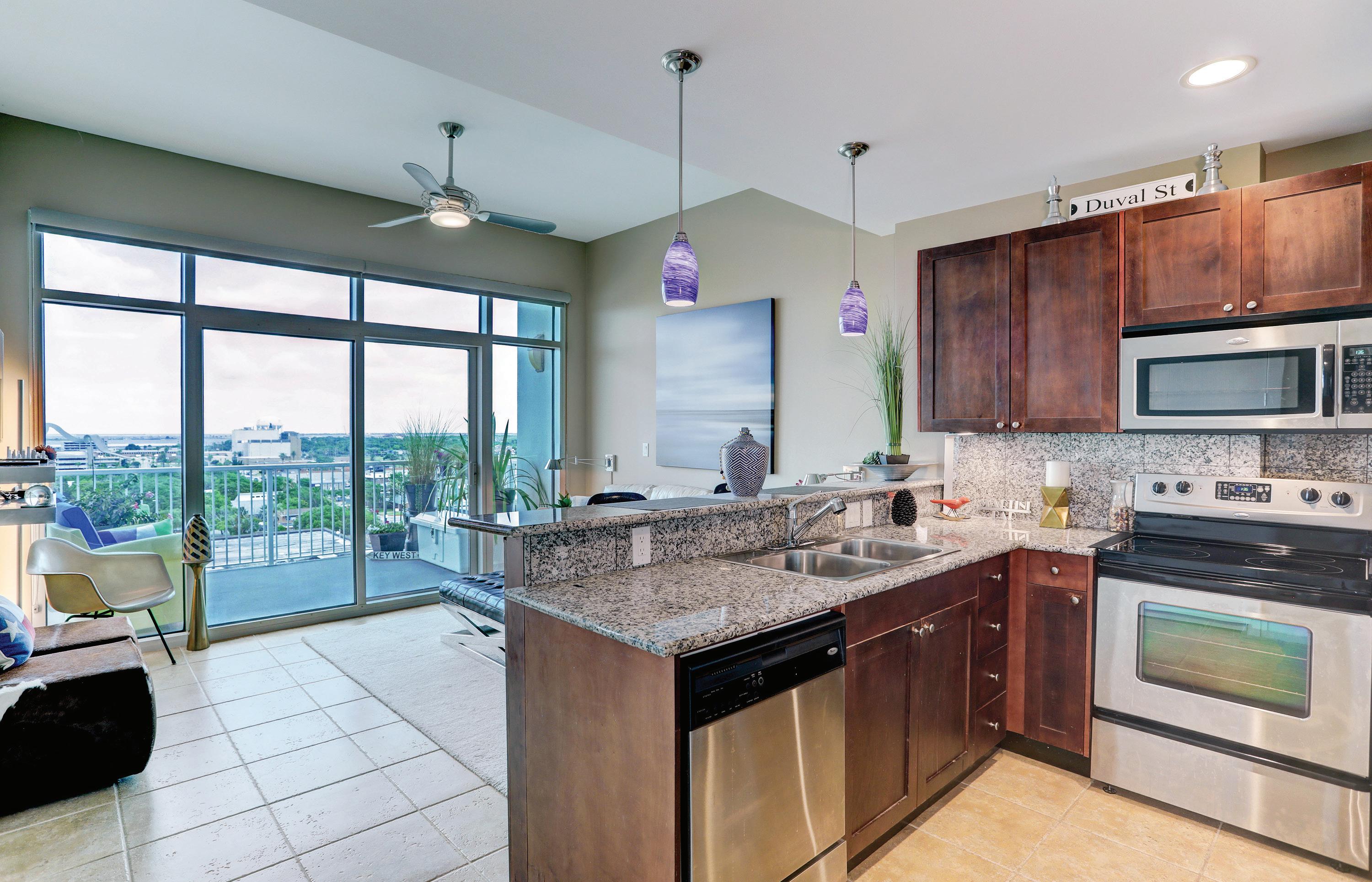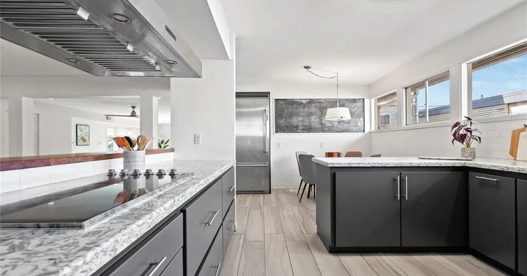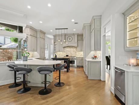 Step inside to discover a grand clerestory, elegant stone and wood flooring, and walls of windows adorned with transoms. The kitchen is a chef’s dream with quartz countertops, a central island, and top-of-theline stainless steel appliances.
