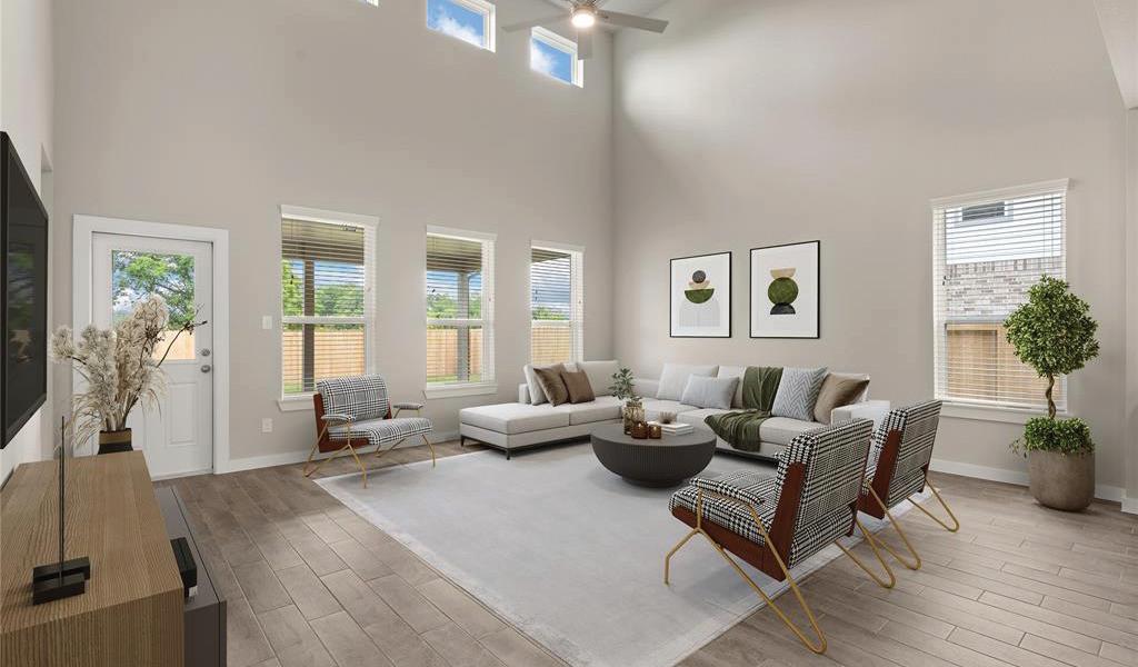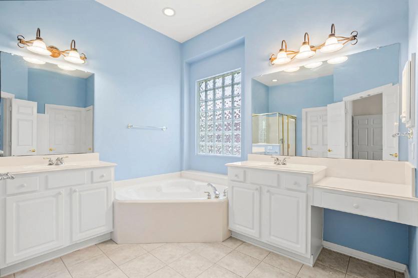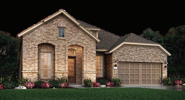Two-story rotunda entry. Family room with a wall of windows and a wood mantel fireplace. Home office with French doors and formal dining room. The kitchen features an island with built-in seating space, a double wall oven, a 5-burner gas cooktop, a walk-in pantry, and Butler’s pantry. The kitchen also opens to the morning area and family room. Secluded primary bedroom. The primary bath includes a corner garden tub, a separate glassenclosed shower, dual vanities, two walk-in closets, and a linen closet. Game room, media room, secondary bedrooms, and Hollywood bath complete the second floor. Abundant closet space. Extended covered backyard patio. Mudroom just off the three-car garage.