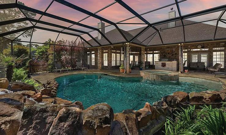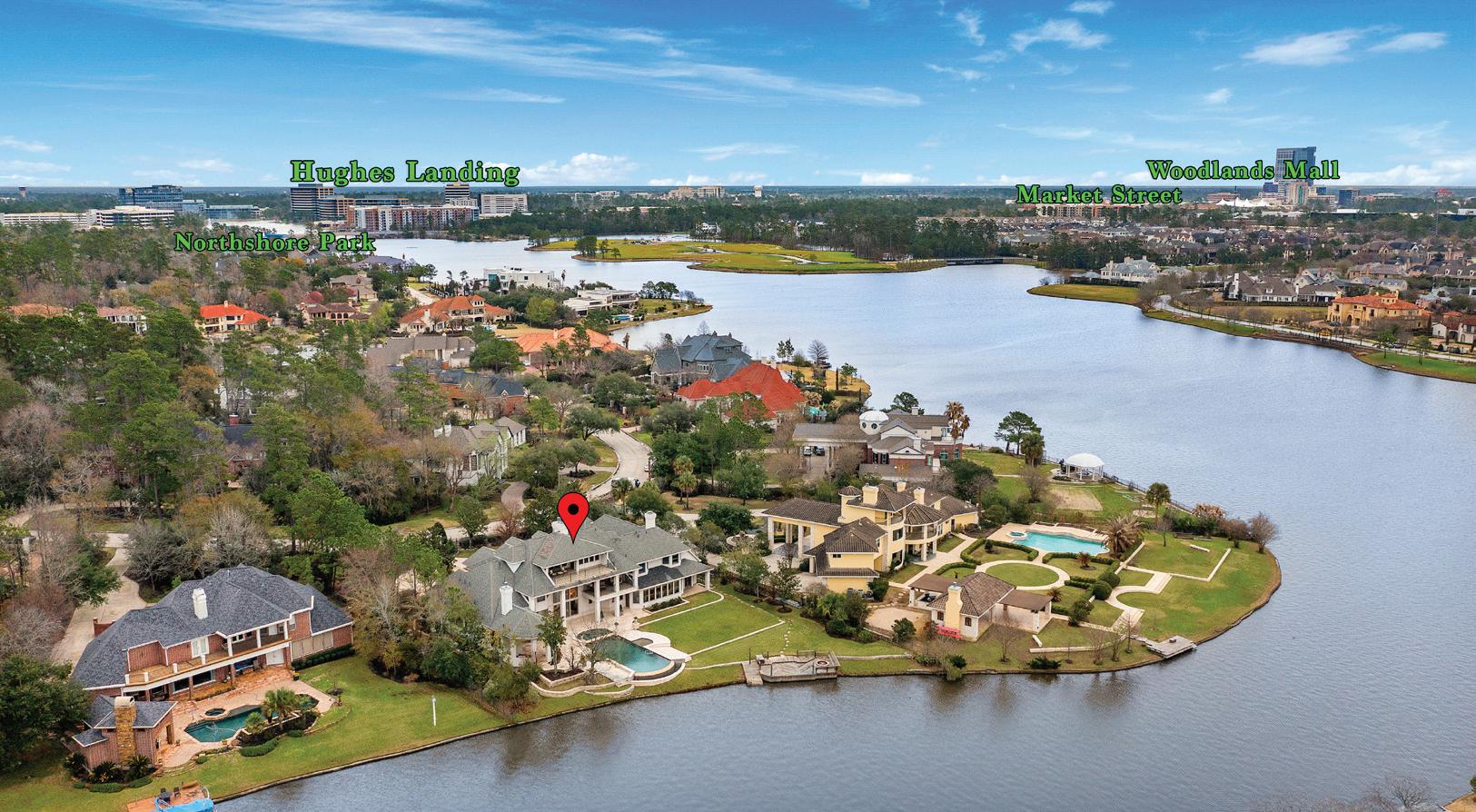 $3,850,000 | 6 BEDS | 7 FULL, 3 HALF BATHS | 9,044 SF Lakeside living at its finest on a premium waterfront lot at a prestigious address in the coveted West Isle neighborhood in The Woodlands TX--named the #1 Best City to Live in America for the 2nd straight year. With expansive lake views from rear windows + numerous balconies, this approx. 9,000 square ft estate home was custom designed for family living, grand scale + casual entertaining. This 3-story mansion features multiple formal + casual living and entertaining areas, including a music room, wine grotto, library, home office, gameroom, media room, billiard room + exercise room. 6 bedrooms all have en-suite bathrooms. An additional full bath, 3 powder rooms + abundant storage. Four fireplaces, spectacular millwork, soaring ceilings. Four car garage w/workshop. Stunning infinity pool + spa, outdoor kitchen, private boat dock w/ firepit. This custom estate home is available at a great value, at fraction of the cost and time to build new on East Shore’s few remaining waterfront lots.