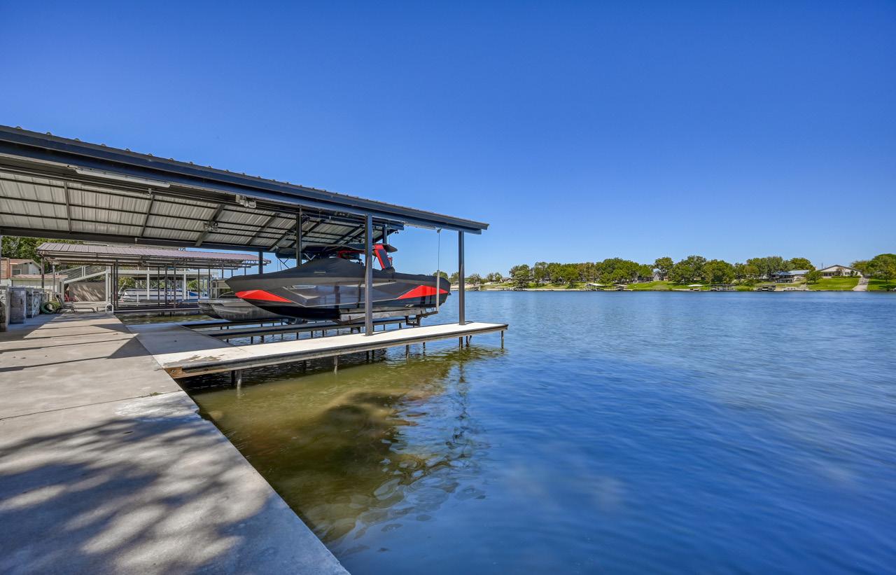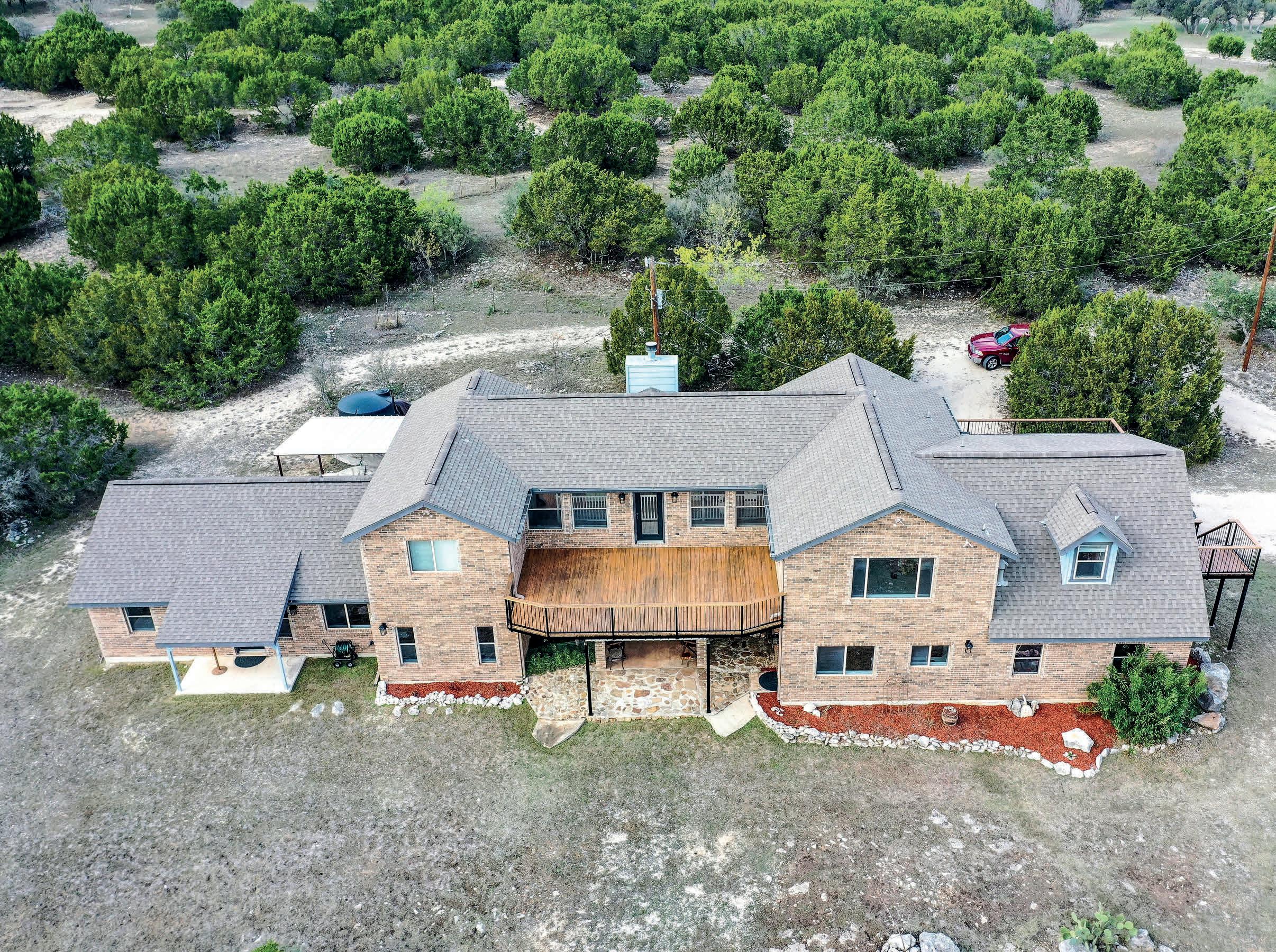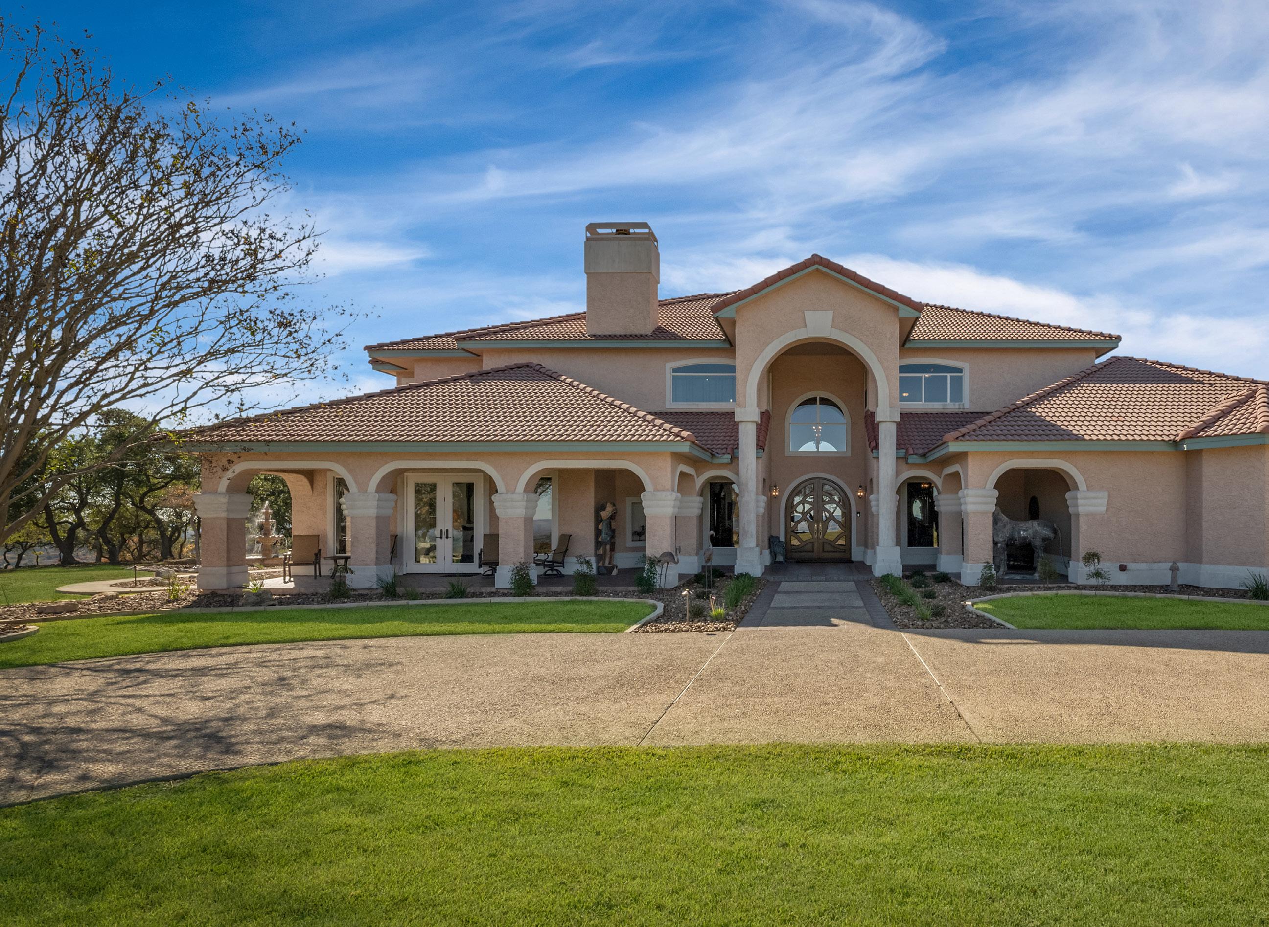 5100 sq ft of living area, Open waterfront on Lake LBJ, Double boat slip, 6 bedrooms, 6 baths, 2 kitchens(one indoor/ outdoor opens up to poolside with large glass doors, other inside), game room, wood grain vinyl flooring throughout house, granite countertops in Kitchen, 25 ft. ceiling in living area, open living area including kitchen, short glass wall around the upstairs walkway, wood ceilings in indoor/outdoor kitchen and back porch, upper deck waterside, sliding glass doors around the entire back of home which brings in a complete water view, marble backsplashes in Kitchen, gorgeous tiles in all bathrooms. Located on a wide-open area of the Llano River Arm on Lake LBJ, in the Comanche Rancheria subdivision, short-term rentals are allowed.