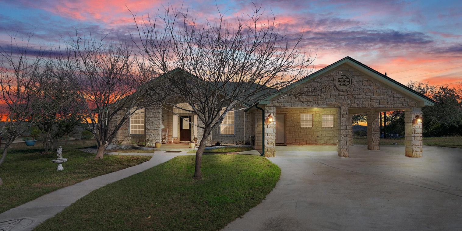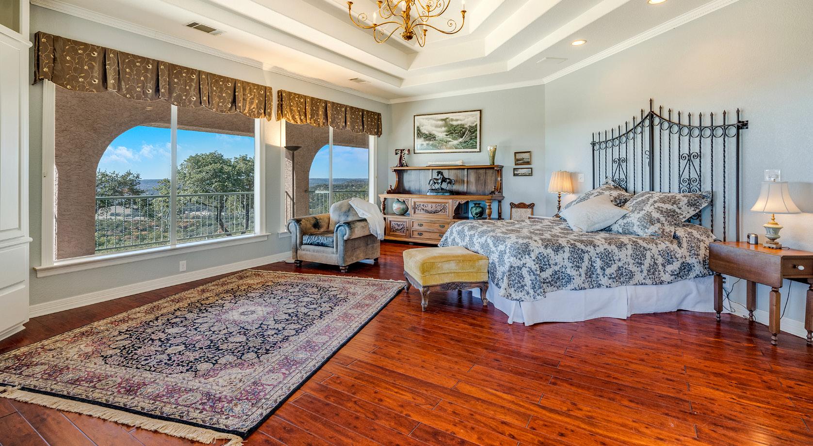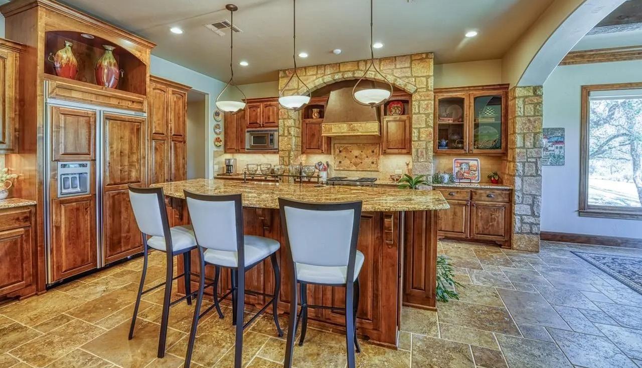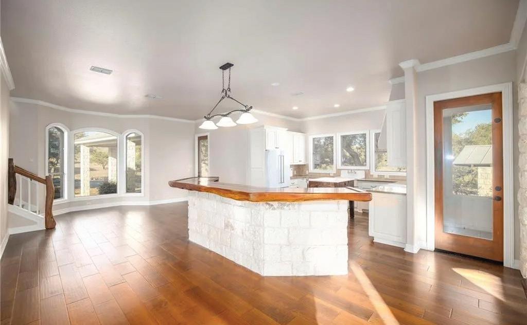 5100 sq ft of living area, Open waterfront on Lake LBJ, Double boat slip, 6 bedrooms, 6 baths, 2 kitchens(one indoor/ outdoor opens up to poolside with large glass doors, other inside), game room, wood grain vinyl flooring throughout house, granite countertops in Kitchen, 25 ft. ceiling in living area, open living area including kitchen, short glass wall around the upstairs walkway, wood ceilings in indoor/outdoor kitchen and back porch, upper deck waterside, sliding glass doors around the entire back of home which brings in a complete water view, marble backsplashes in Kitchen, gorgeous tiles in all bathrooms. Located on a wide-open area of the Llano River Arm on Lake LBJ, in the Comanche Rancheria subdivision, short-term rentals are allowed.
