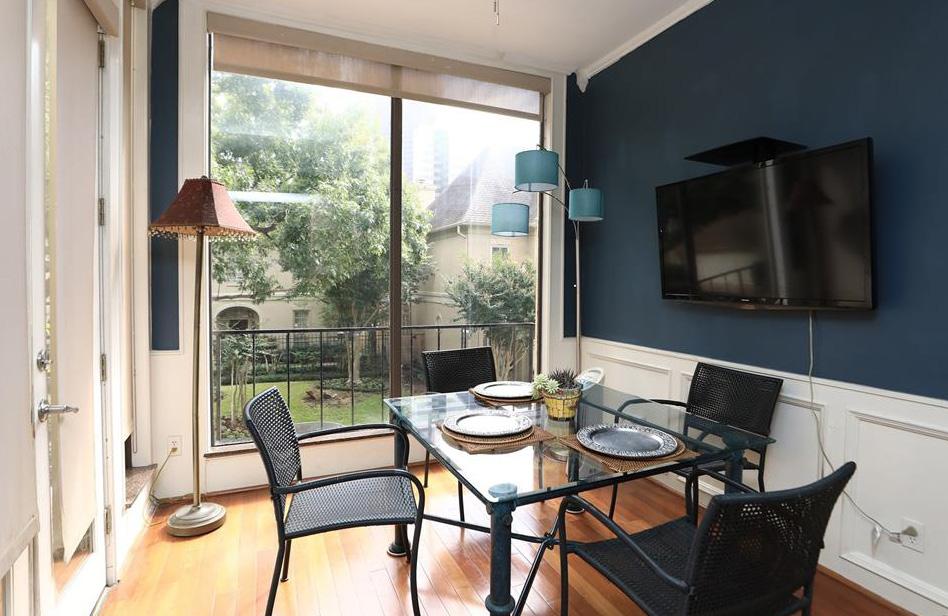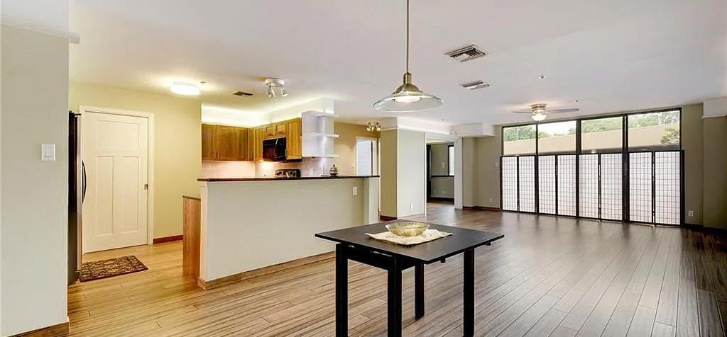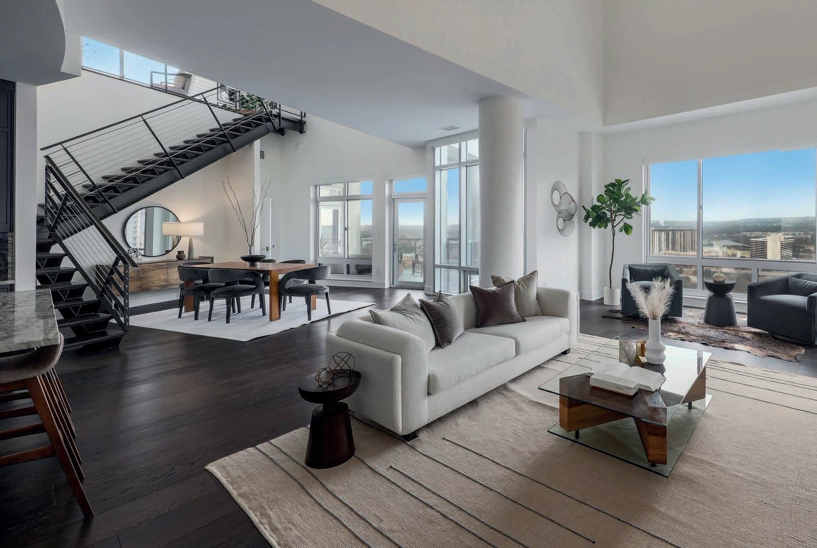 features. Along with the views, the living room has several palatial wall spaces for displaying art. Each bedroom comes with stunning river views, its own balcony, and a marble-tiled bathroom with a large walk-in closet. There is a half-bathroom off the entrance for guest use. Upstairs you find the mezzanine loft and another balcony. Here is the perfect flex space for a golf simulator, home gym, office, or media lounge (or all of those at once). Every window in the unit is completed with remote-controlled window treatments by The Shade Store. This residence is deeded with three ground-level, reserved garage parking spaces and two storage units. Other condo amenities include a pool, gym, gated parking, conference room, 24-hour front desk, as well as access to the Van Zandt Hotel pool/restaurant. Current development in the area will bring even more high-end retail and restaurants. You do not want to miss out on this one!