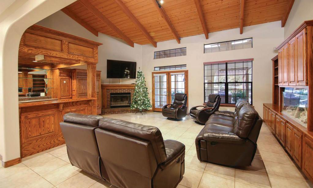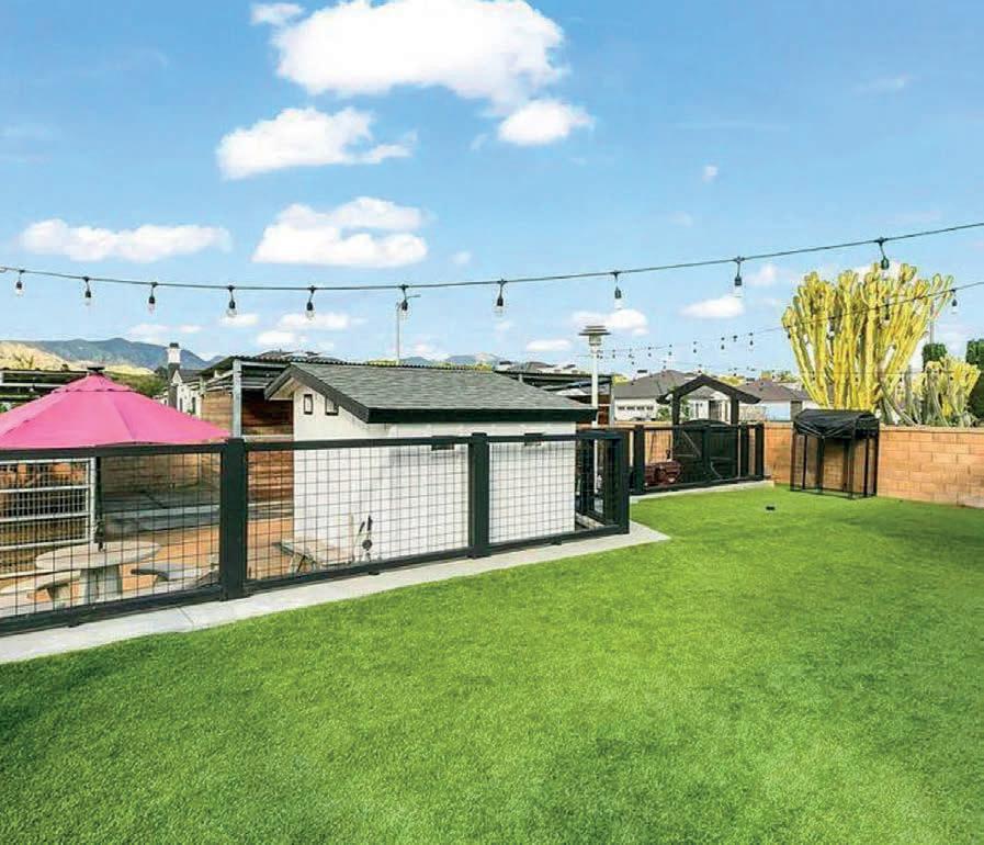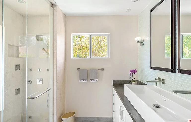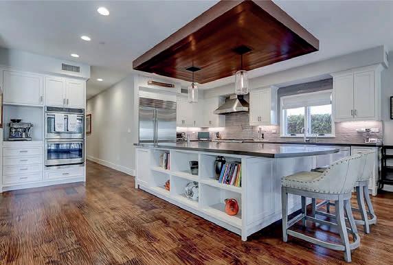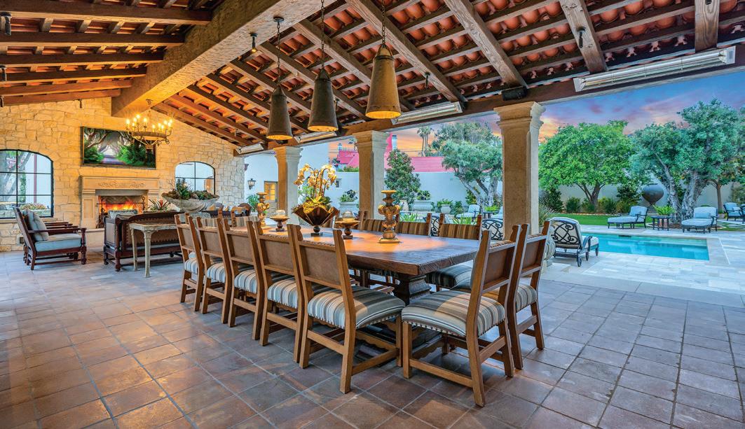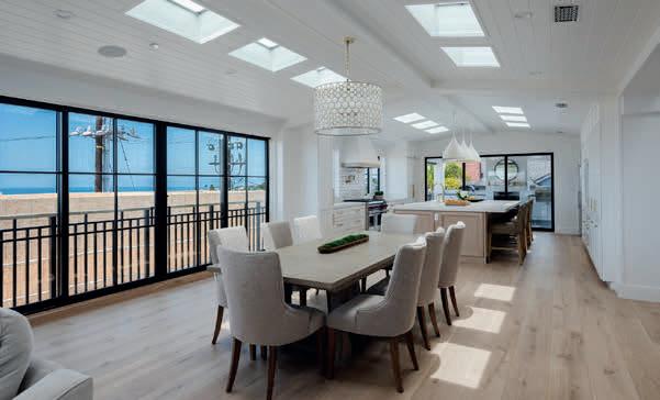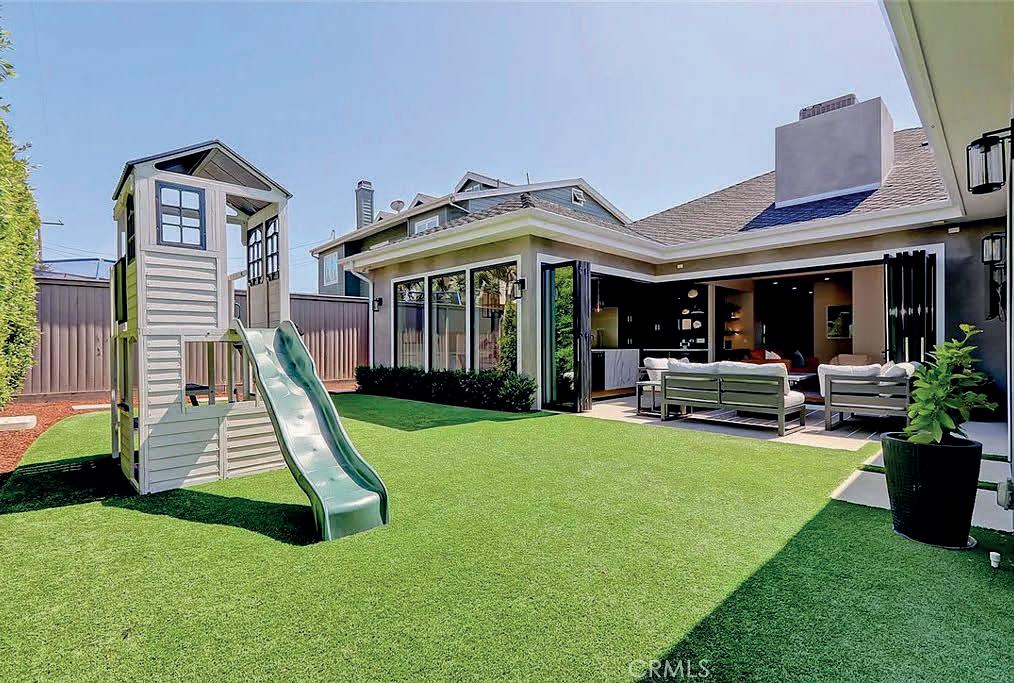 Past the sustainably harvested garapa wood windows at the front exterior lies a 10-foot10 foot high, pitched oak ceiling entryway that leads to retractable floor-to-ceiling glass doors allowing the great room to seamlessly merge into the eco-conscious backyard landscaping. Outside is an entertainer’s paradise with a custom barbeque station, multiple lounge areas, and a fire pit.