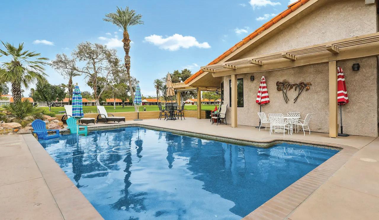 Welcome to Marrakesh, one of the hottest clubs in the desert with the newly remodeled clubhouse! Don't miss this unique opportunity to own a rare expanded C Plan situated on an elevated, corner lot with beautiful West facing mountain views. Enjoy 3 private bedroom suites, 3 bathrooms, with endless possibilities to make this your own. For those who love to entertain, or enjoy the morning sun, the extra large & private walled front courtyard has been expanded, with a beautiful water feature and elevated sitting area with firepit to enjoy the beautiful mountain views to the East, so unlike most homes in Marrakesh, you have beautiful views from both front and backyards. Don't miss out on this incredible opportunity and a great value!