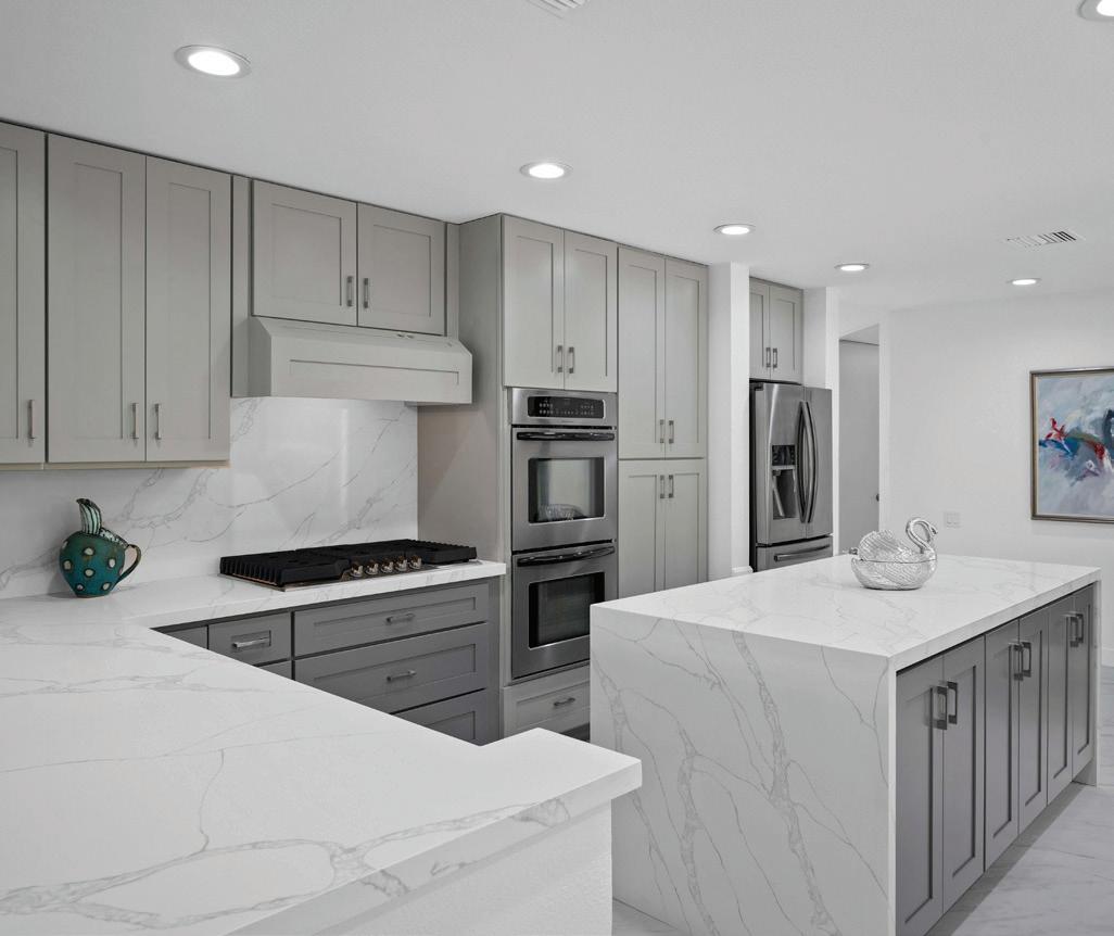 The chef’s kitchen features Meile appliances, Calacatta Borghini waterfall islands, custom-designed cabinetry and pantry, a full wet