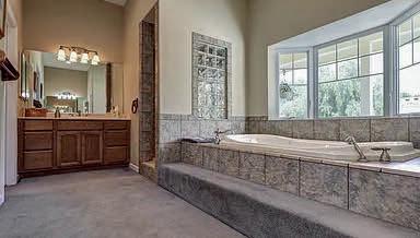 and two closets, one is a walk-in. The master bathroom is also divided into two separate rooms, one with vanity and the other a large shower. Just off the master bedroom is a retreat with access to the covered patio. This