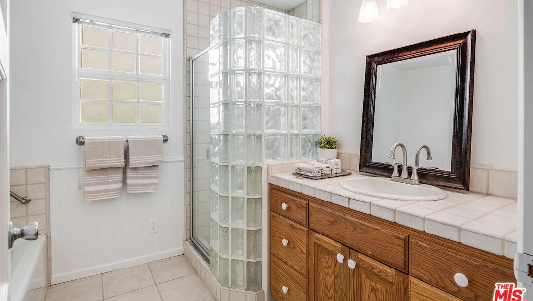 abundance of natural light and bring the outside in. The elegant master retreat has sliders that open to a balcony overlooking the lush grounds. Sumptuous bath features an oversized shower, soaking tub and a huge walk-in closet. The property opens seamlessly with multiple sliders to the entertainer’s backyard. The spacious, manicured grounds feature mature landscaping for privacy, all surrounded by lush greenery. The sparkling infinity pool has built-in spa and baja shelf, both with a waterfall edge. Patio area with bbq wraps around the pool. Guest house with private entrance on Saugus has full kitchen with stainless steel appliances and quartz counters with center island. Living room has a wall of sliders leading out to the yard. With 700 sqft the space is perfect for a home office or extended family. This property is a true oasis which fully encompasses the California indoor/outdoor lifestyle.